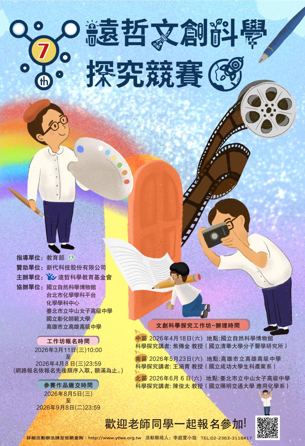 閱讀更多 →一、依據財團法人遠哲科學教育基金會115年3月4日遠企字第1150000025號函辦理。 二、財團法人遠哲科學教育基金會秉持發展全民科學普及教育之宗旨,致力於提升青少年科學素養與實作能力。本年度持續辦理「第七屆遠哲文創科學探究競賽」,期盼透過結合「科學探究」與「文創表達」,深化科學教育之推廣。 三、本競賽相關資訊如下: (一)對象: 全國對科學探究有興趣之國中、高中(職)在學學生。 (二)報名日期...