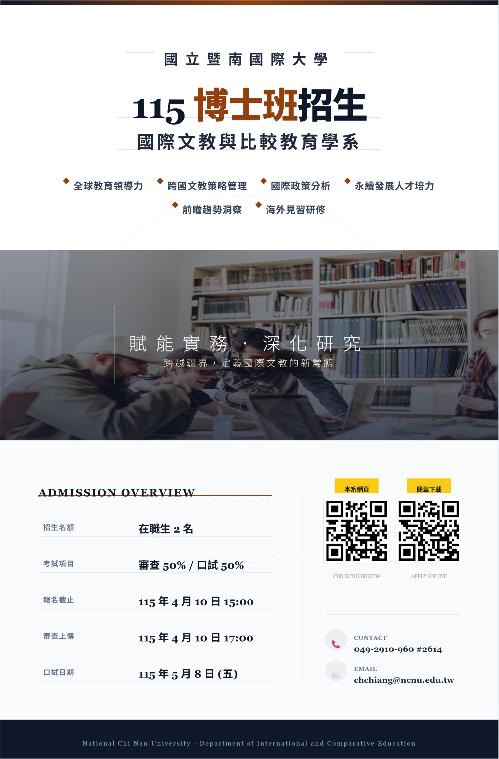 | [類別] 標題 | [11502239] 轉知國立暨南國際大學國際文教與比較教育學系115學年度博士班入學考試資訊。 |