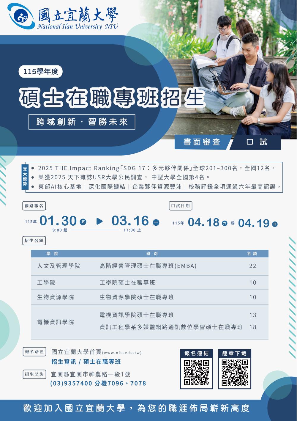 閱讀更多 →一、依據國立宜蘭大學115年1月12日宜大教字第1151000158號函辦理。 二、本招生一律採網路報名,報名日期:自115年1月30日上午9時起至115年3月16日下午5時止,報名網址: https://ccsys.niu.edu.tw/exam/emsexam/。 三、招生簡章自即日起於該校招生資訊網頁公告。請詳見招生簡章,請至該校招生資訊網(https://admniu. niu.edu.t...