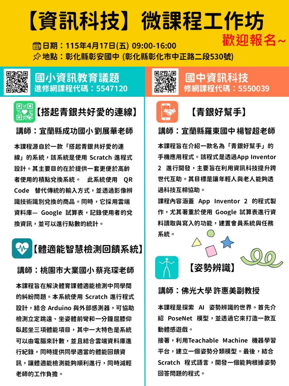 一、研習時間:115/04/17(五)09:00–16:00 二、研習地點:彰化縣彰安國中 (彰化縣彰化市中正路二段530號) 三、本次研習國中、國小場次同步辦理         (一)國小報名網址:https://www5.inservice.edu.tw/NAPP/CourseView.aspx?cid=5547120  (教師在職進修網代碼:5547120)         (二)國中報名網...