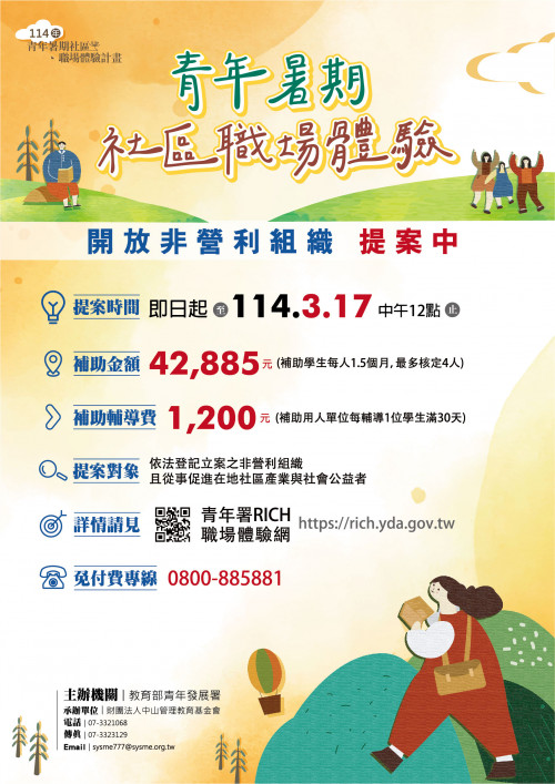 | [類別] 標題 | [11401500] 轉知:財團法人中山管理教育基金會辦理「114年青年暑期社區職場體驗計畫」,即日起至114年3月17日中午12時止開放全臺非營利組織提案申請,請查照。 |