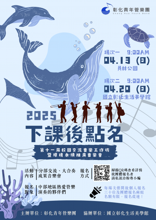 | [類別] 標題 | [11401735] 轉知彰化青年管樂團114年4月13日及4月20日辦理《下課後點名》校園交流工作坊暨音樂發表會,歡迎踴躍參加,請查照。 |