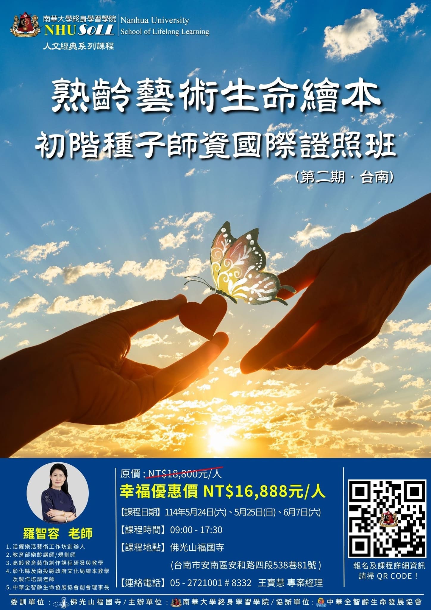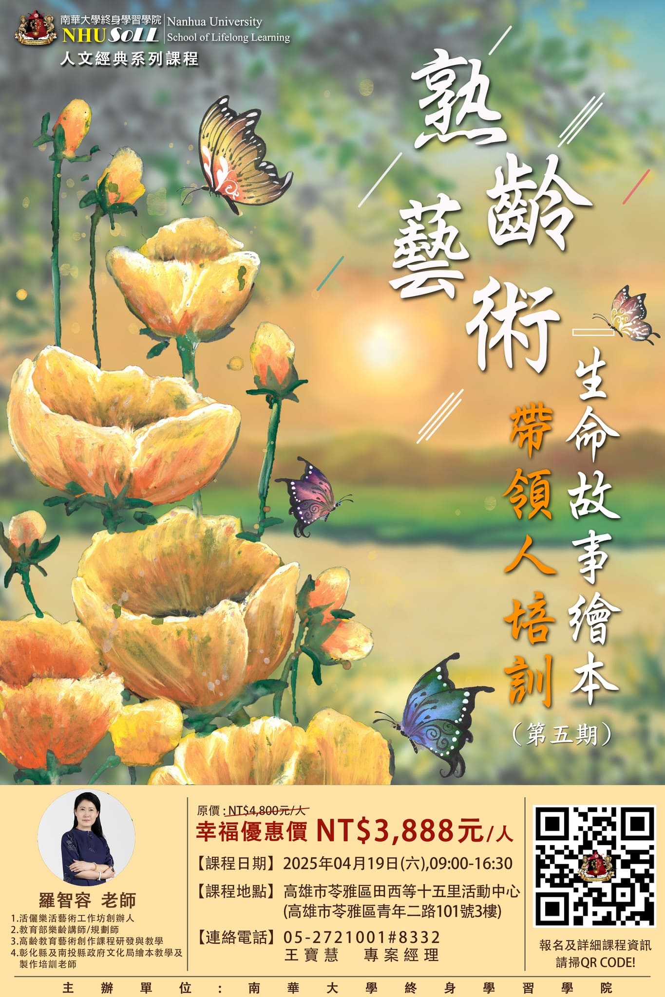 一、【熟齡藝術生命故事繪本】帶領人培訓班(第五期)課程 (一)課程目的:培養熟齡繪本教師前導課,以繪本為媒介,引領長者心靈成長並運用繪本提昇 自我價值,及生命意義提昇之技巧。 (二)上課日期/時間:114年4月19日(週六)9時至12時、13時至16時,共六小時。 (三)上課地點:高雄市苓雅區田西等十五里活動中心(高雄市苓雅區青年二路101號3樓)。 (四)課程講師:羅智容老師。 (五)【幸福優惠價】新台幣3,888元/期(課程原定價:新台幣4,800元/期)。 (六)線上報名網址:https://lihi2.com/b52IU/edoc。 (七)課程單元內容:請參見附件課程海報、招生簡章。 (八)聯絡電話:05-2721001#8332王寶慧專案經理。 二、【熟齡藝術生命繪本】初階種子師資國際證照班(第二期‧台南)課程 (一)上課日期/時間:114年5月24日(週六)、5月25日(週日)、6月7日(週六)。 (二)課程地點:佛光山福國寺(臺南市安南區安和路四段538巷81號)。 (三)課程講師:羅智容老師。 (四)【幸福優惠價】新台幣16,888元/期 (含一套教材費)(課程原定價:新台幣18,800元/期)。 (五)線上報名網址:匯款:https://lihi2.com/MHUNy/email。線上刷卡:https://lihi2.com/QaBCR/email。 (六)相關新聞媒體報導,請參見https://www.facebook.com/share/p/1A6LEbFiyg/。 (七)課程單元內容:請參見附件課程海報、招生簡章。 |