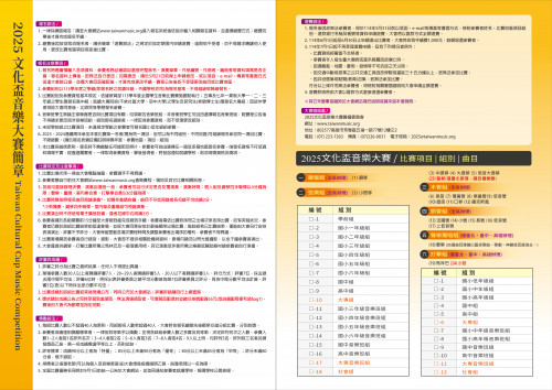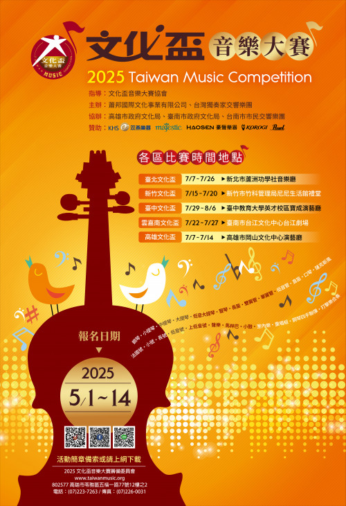 說明: 一、依據中華民國文化盃音樂大賽協會114年2月26日文化盃賽字第1140226號函辦理。 二、2025 文化盃音樂大賽於114 年5 月1 日起受理線上報名;7月7 日起陸續於臺北、新竹、臺中、臺南、高雄等地進行 比賽。 三、相關訊息請至大會網站www.taiwanmusic.org 查詢。 四、檢附比賽簡章及海報各1份。 |