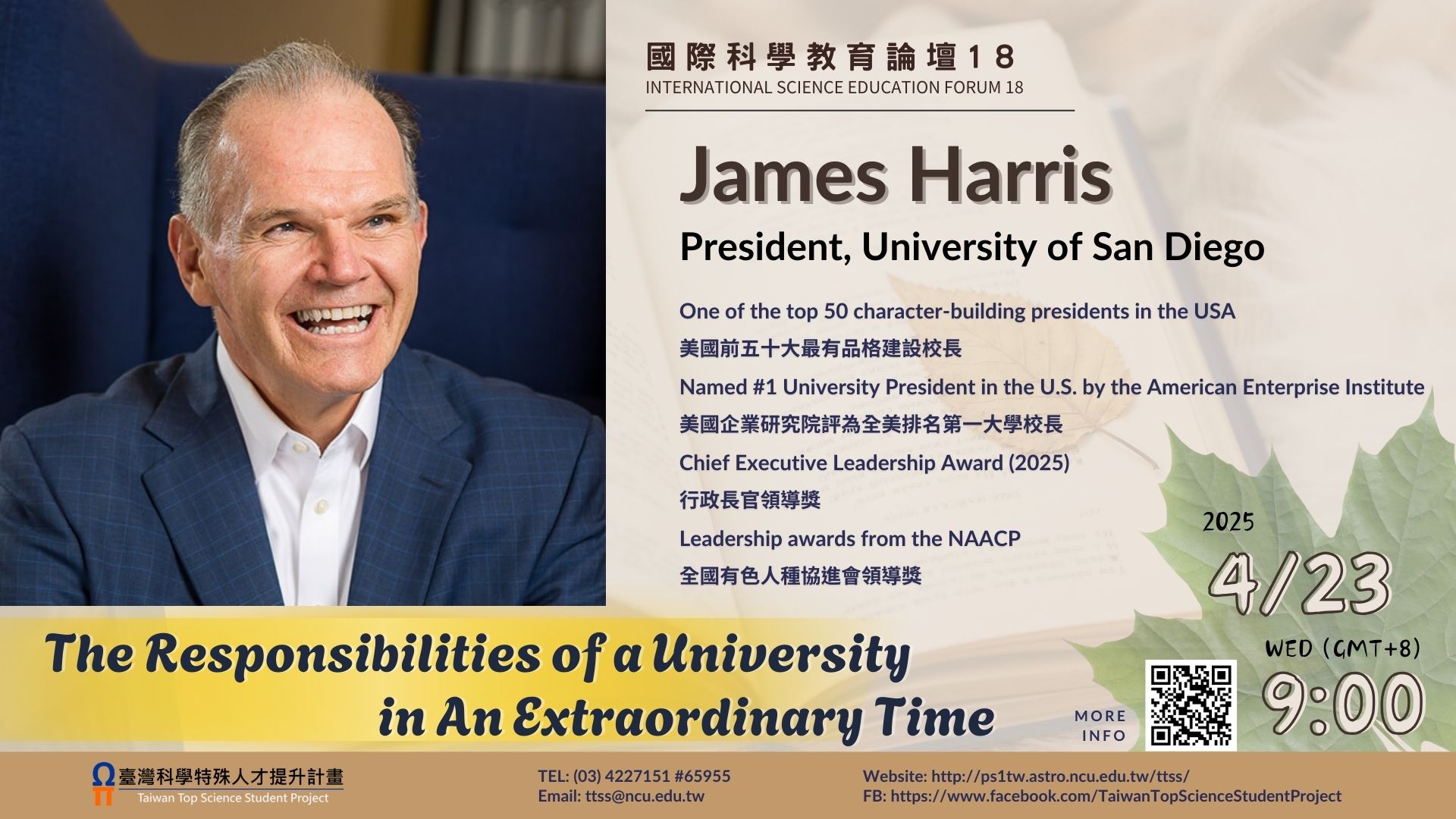 一、依據國立中央大學114年3月14日中大理天字第1143200114號函辦理。 二、本次講座由聖地牙哥大學校長Dr. James Harris主講。研究教育學的他,在擔任校長期間,除了因營運管理及生活環境使聖地牙哥大學被評為全美最佳大學之一,也使其大學在可持續性、多樣性與包容性方面贏得了廣泛的讚譽。Dr. Harris也在2024年被美國企業研究院評為全美排名第一大學校長。此次演講將與我們探討在特殊時期的大學責任。 三、《國際科學教育論壇系列18》活動訊息如下: (一)講者:Dr. James Harris(聖地牙哥大學校長)。 (二)講題:The Responsibilities of a University in An Extraordinary Time。 (三)主持人:葉永烜 教授(國立中央大學天文研究所)。 (四)時間:114年4月23日,上午9時(GMT+8)。 四、報名方式:敬請於以下連結完成線上報名:https://forms.gle/f87ovMYomKTdG3K16 五、「臺灣科學特殊人才提升計畫」臉書網址:https://www.facebook.com/TaiwanTopScienceStudentProject |
