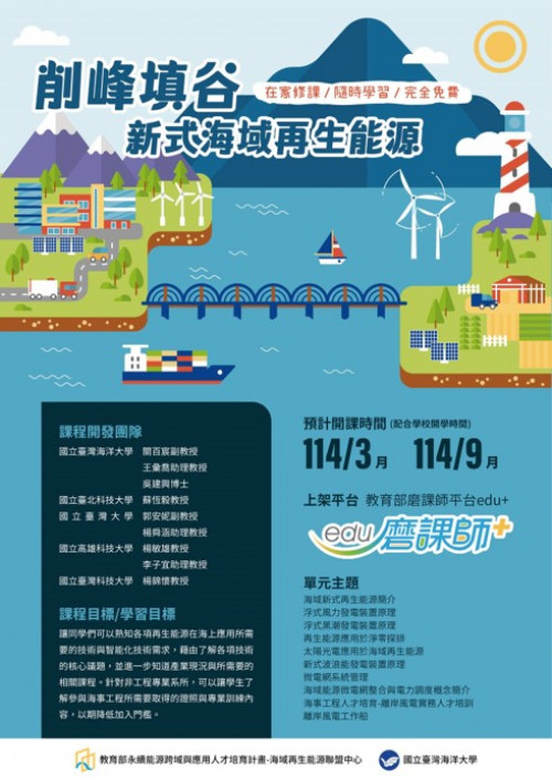 一、依據國立臺灣海洋大學114年3月24日海船字第1140006514號函辦理。 二、課程內容聚焦於海上再生能源的應用與發展,全面介紹技術需求與智能化挑戰。內容涵蓋海事工程基礎、浮式風機的動態控制技術等,適合對此領域有興趣之相關人員。 三、旨揭磨課師課程於教育部磨課師平臺開課(https://moocs.moe.edu.tw/moocs/#/home),屬「環境教育」標籤,研習時數共計8小時。 四、自即日起開放報名至114年4月30日截止,總課程結束日期為114年6月30日(各時程安排以磨課師平臺課程公告資訊為準)。 五、教育部「磨課師平臺」操作相關疑義,請逕洽詢平臺網頁下方客服專線;如對課程或時程有所疑問,歡迎來信:energyntou@gmail.com。