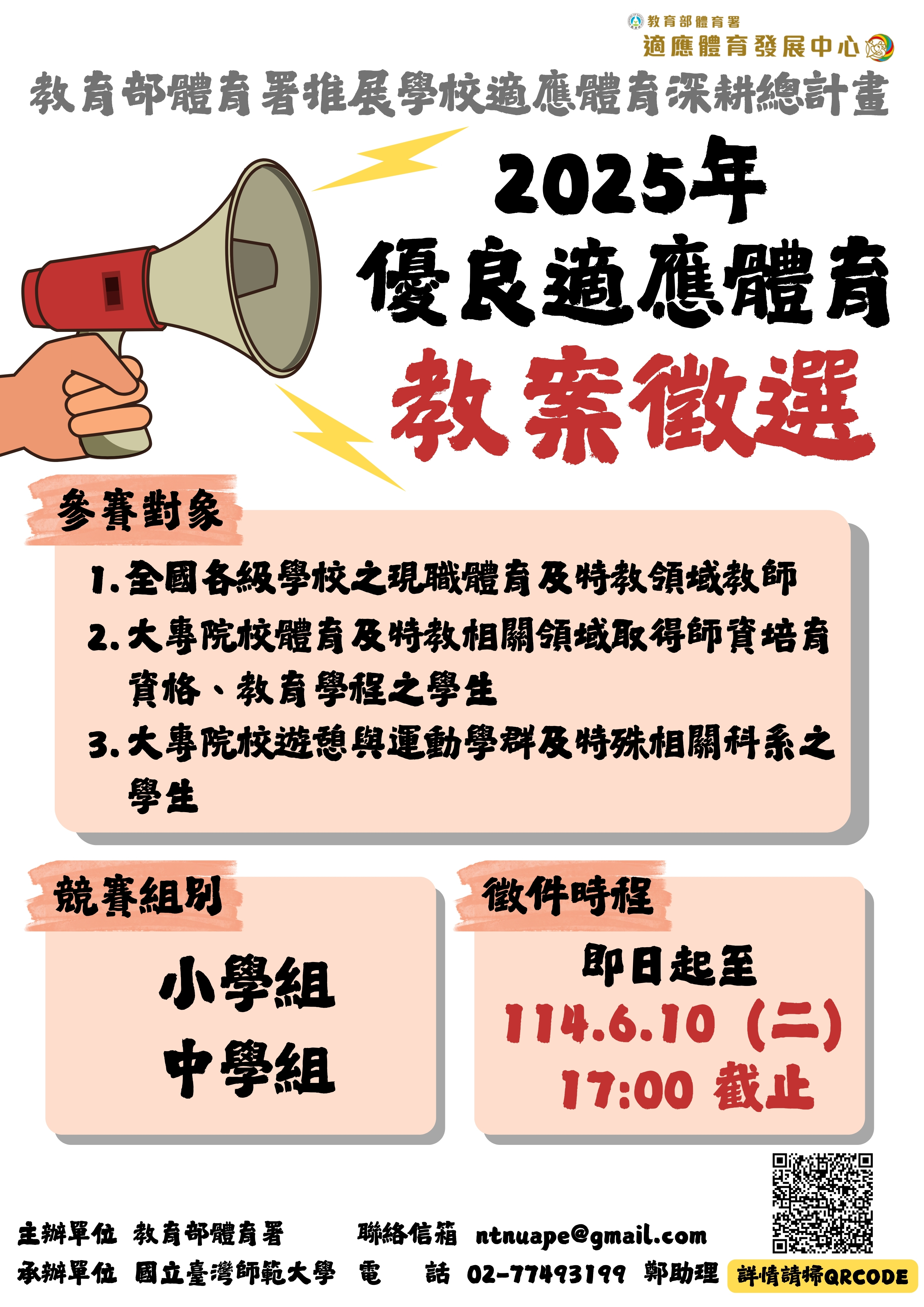一、依據教育部體育署114年3月19日臺教體署學(二)字第1140008204號函辦理。 二、為鼓勵特殊教育與運動教育人員研發適應體育教材,將融合概念及身體素養融入各項體育教學活動中,幫助身心障礙學生與一般學生在運動中一起學習與成長,特委請國立臺灣師範大學辦理旨揭活動。 三、 本案活動重要資訊摘錄如下,詳見附件簡章: (一) 徵件時程:自即日起至114年6月10日(星期二)下午5時止。 (二) 參加對象:符合下列任一資格者均可報名參加,每團隊人數為1至2人,每人以報名1組為限。 1、 全國各級學校之現職體育及特教相關領域教師(均含正式、代理、代課、兼課和實習教師)。 2、大專院校之體育相關領域或特教領域取得師資培育資格之學生(應檢附師培相關證明或修課證明)。 3、全國大專院校遊憩與運動學群相關及特教相關科系之學生。 (三) 徵選組別:依教育階段分為小學組及中學組 。 (四) 投稿方式:一律採線上報名。 (五) 錄取結果預定於114年7月25日(星期五)下午5時前公告於適應體育發展中心粉絲專頁(臉書),並以電子郵件通知。 四、本案如有報名或其他問題,請逕洽體育署委辦單位國立臺灣師範大學,聯絡人:鄭凱云專任助理;電話:(02)7749-3199;Email電子信箱:ntnuape@gmail.com。 |
