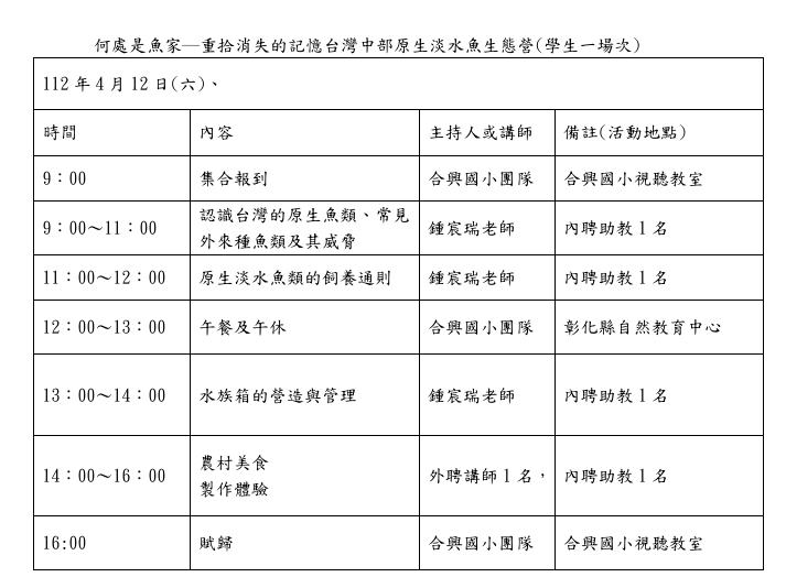 | [類別] 標題 | [11403101] 何處是魚家─重拾消失的記憶台灣中部原生淡水魚生態營-學生場,歡迎本縣國小中高年級學生報名參加,請查照。 | ||