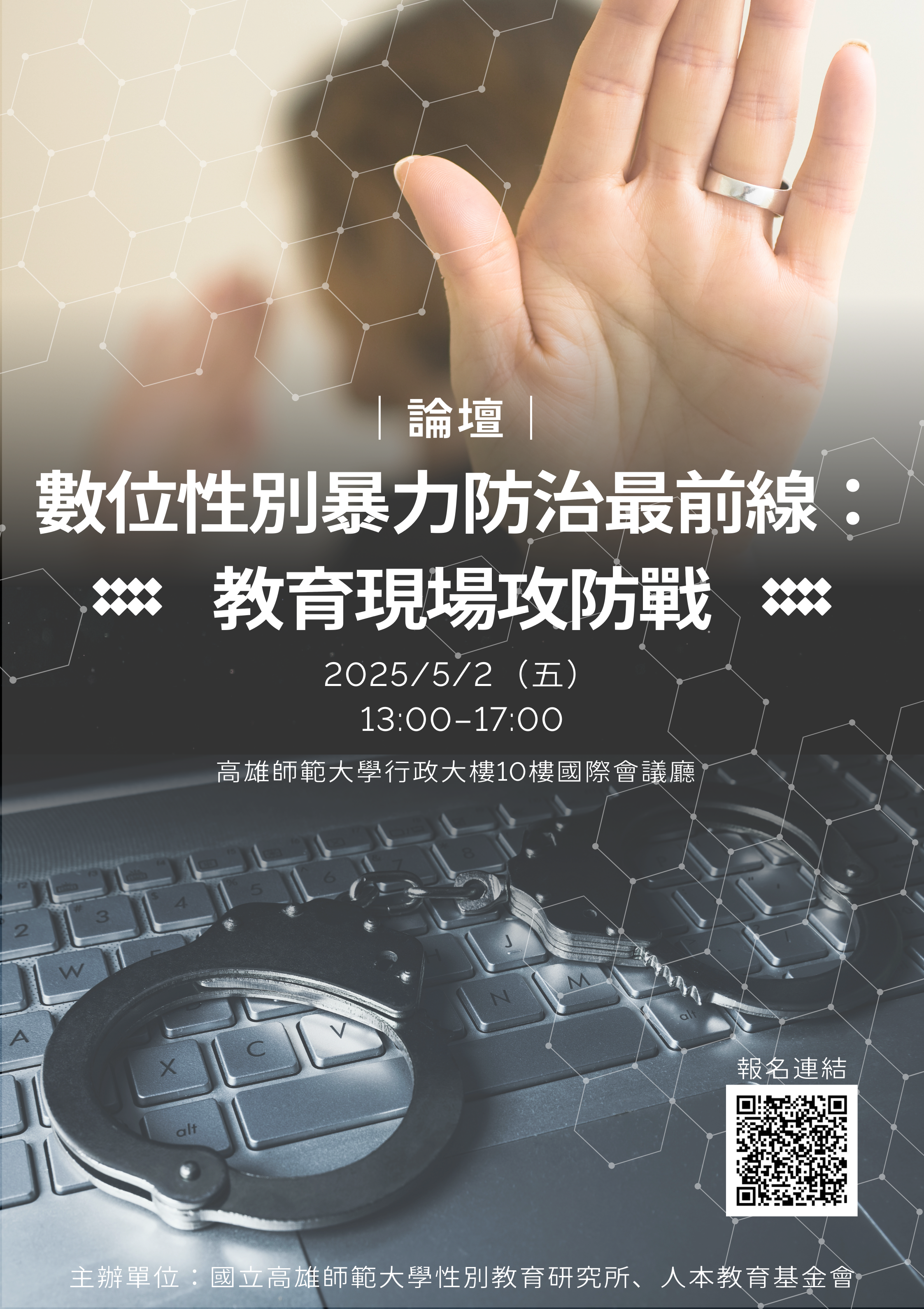 一、依據國立高雄師範大學114年4月8日高師大性研字第1141003032號函辦理。 二、活動資訊 (一)辦理時間:114年5月2日(星期五)下午 1:00 至 5:00。 (二)辦理地點:國立高雄師範大學國際會議廳(高雄市苓雅區和平一路116號行政大樓10樓)。 (三)採網路報名方式:114年4月25日(星期五)前至國立高雄師範大學性別教育研究所網站報名:https://gender.nknu.edu.tw/(最新活動→數位性別暴力防治最前線:教育現場攻防戰),或直接點選報名網址:https://forms.gle/EFk6c7B4Pd7FL6RPA。 三、本活動即日起受理報名,全程參與者可擇一登錄「社工師繼續教育積分」/「公務人員終身學習時數」(性平課程)/「教師研習時數」。 四、活動相關問題,請洽性別教育研究所黃助理,連絡電話:07-7172930分機2010,Email:gender@mail.nknu.edu.tw。 |