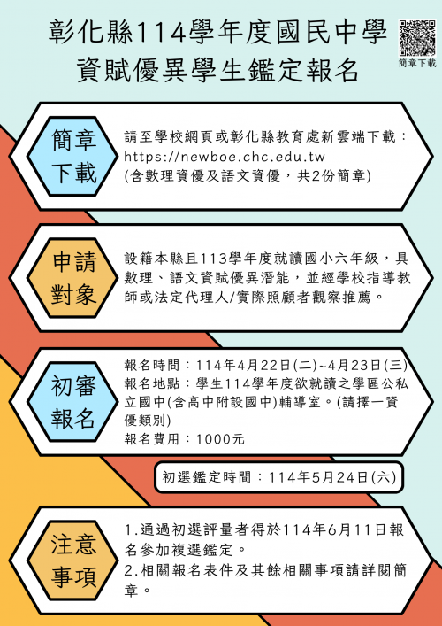 | [類別] 標題 | [11403470] 彰化縣114學年度國民中學資賦優異學生鑑定作業即將開始 |