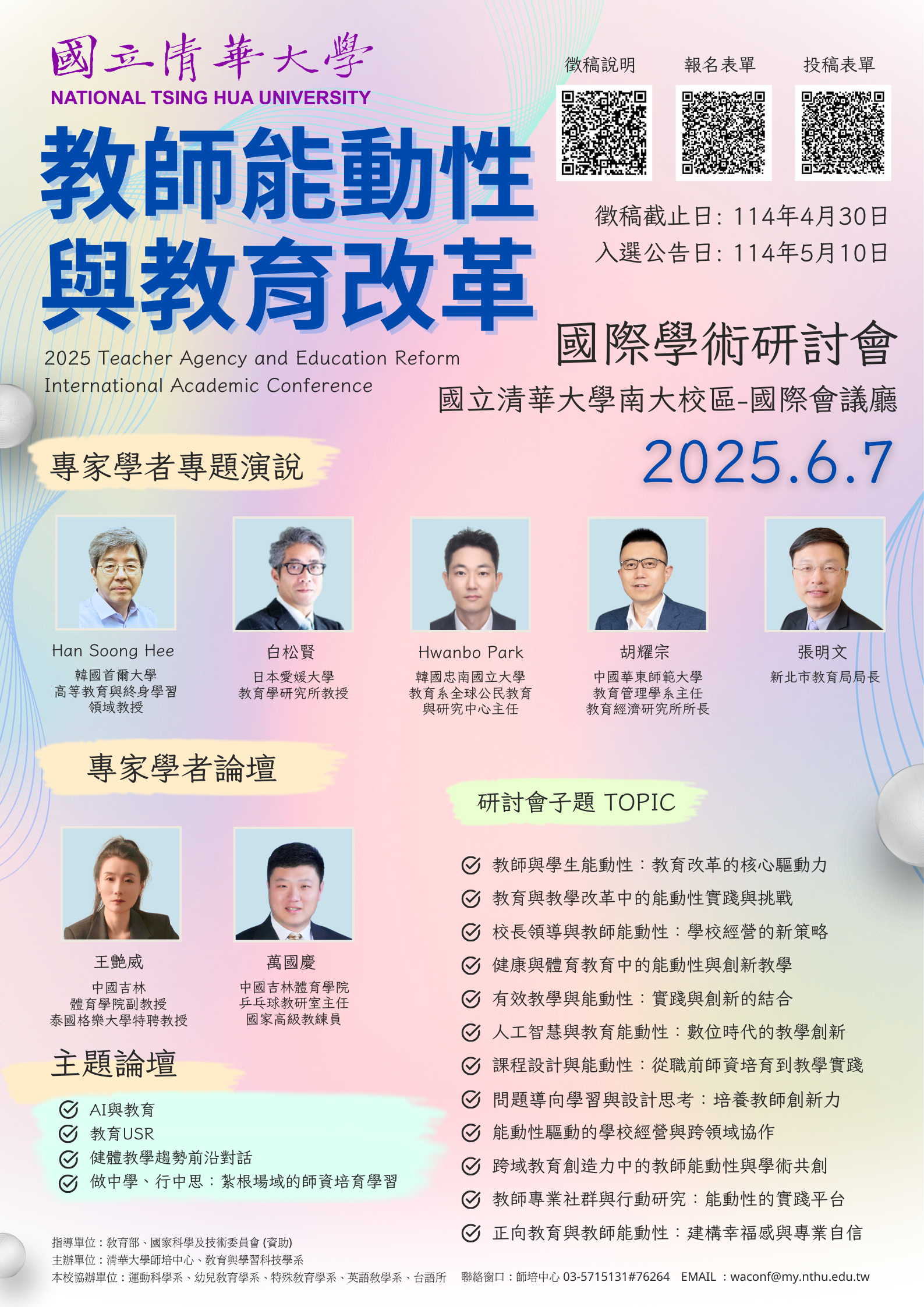 一、依據國立清華大學114年4月11日清師培字第1149002675號函辦理。 二、旨揭國際學術研討會以「教師能動性與教育改革」為主軸,透過國際知名專家學者、國內教育學者及教學實務工作者的發表與分享,探討教師能動性與教育改革相關之學術理論與實務經驗,增進教育工作者之專業成長,共同探討如何提高教學的品質,以應對不斷變化的需求。 三、研討會日期及時間:114年6月7日(六)08:50-15:40。 四、研討會地點:國立清華大學南大校區(新竹市南大路521號)。 五、研討方式:專題演講、論文發表(口頭或海報)、教育專題論壇。 六、投稿重要時程: (一)投稿摘要截稿日期:114年4月30日止。 (二)通知審稿結果日期:114年5月10日前。 七、研討會邀請國內外專家學者與談,包含韓國Han Soong Hee教授、Hwanbo Park教授、日本白松賢教授,以及新北市教育局張明文局長,進行專題演講與學術交流。 八、旨揭研討會徵稿資訊請參閱 https://sites.google.com/view/waconf2025/%E9%A6%96%E9%A0%81。 九、旨揭研討會參與口頭發表或海報發表者將致贈發表證明。 十、檢附旨揭研討會徵稿海報乙份,敬請協助鼓勵投稿報名。 十一、旨揭研討會聯絡信箱:waconf@my.nthu.edu.tw。 |