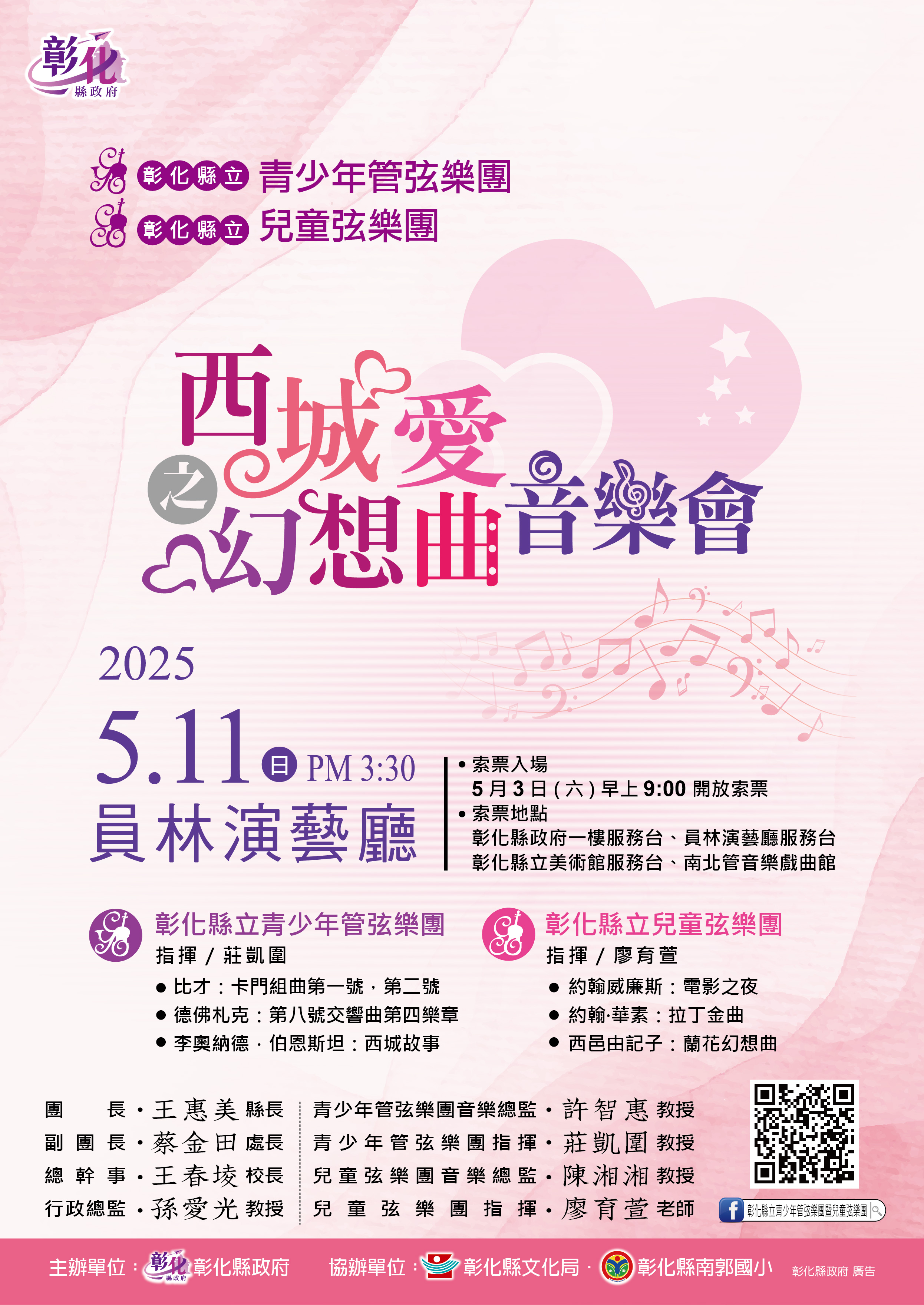 ? 彰化縣立青少年管弦樂團暨兒童弦樂團114年度公演《西城愛之幻想曲》隆重登場!✨ 一年一度的音樂盛事即將到來!彰化縣立青少年管弦樂團暨兒童弦樂團將於114年5月11日(星期日)下午3時30分在員林演藝廳舉辦年度公演《西城愛之幻想曲》,誠摯邀請熱愛音樂的您前來感受青春與音符交織的華麗樂章! ? 演出曲目精采可期: ? 兒童弦樂團: 1.保羅·克雷斯頓:《五支小舞曲》。 2.西邑由記子:《蘭花幻想曲》。 3.約翰·華素:《拉丁金曲》。 4.約翰·威廉斯:《電影之夜》 ? 青少年管弦樂團: 1.喬治·比才:《卡門組曲》第一號、第二號。 2.李奧納德·伯恩斯坦:《西城故事》。 3.德佛札克:《第八號交響曲》第四樂章。