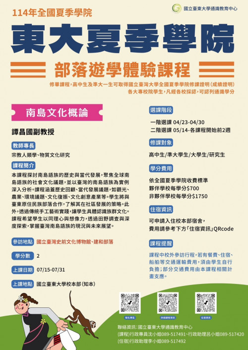 二、旨揭活動為國立臺東大學夏季學院開辦之「部落遊學體驗課程」,以協助推動全民原教,歡迎高級中等學校原住民學生及非原住民學生報名參加,課程結束後可取得國立臺灣大學頒發之修課證明。