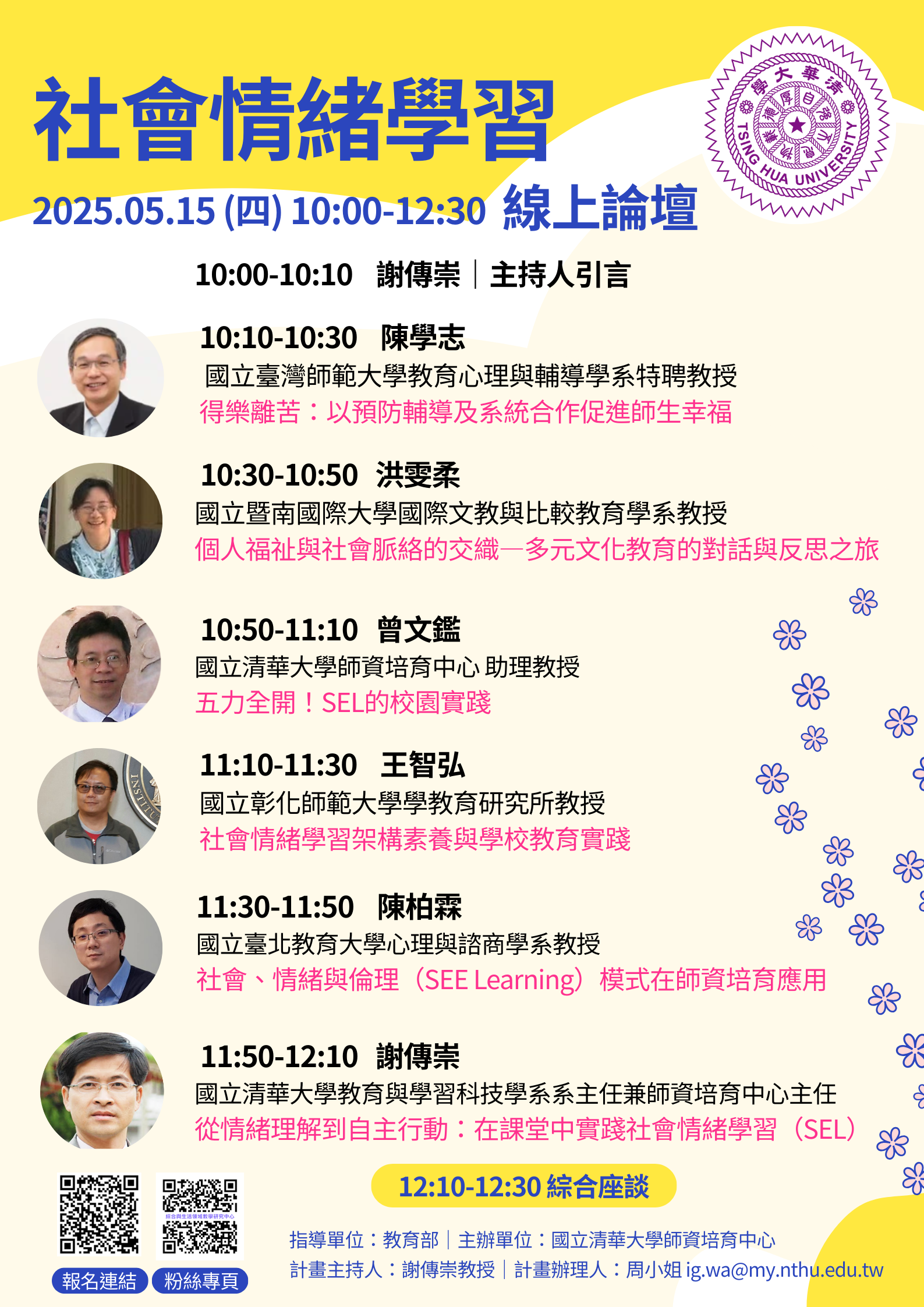 一、依據國立清華大學114年5月1日清師培字第1149003233號函辦理。 二、旨揭論壇以「社會情緒學習」為主題,旨在探討如何透過系統性教學,培養學生的自我覺察、情緒管理、人際互動與責任決策能力。透過專家講座與實務交流,期能協助教師深化SEL理念與教學策略,進而促進學生全人發展,強化學校教育支持系統。 三、論壇主持人為謝傳崇教授,邀請與談人包括陳學志特聘教授、洪雯柔教授、王智弘教授、陳柏霖教授與曾文鑑助理教授,針對主題進行專題演講與分享。 四、報名方式:請於5月13日前完成線上報名,因人數有限,錄取方式以報名先後順序為準,報名連結:https://forms.gle/xfB8cjKZCXjt64a37。 五、舉辦方式:旨揭論壇全程採用線上方式(Google Meet)進行,完成報名之與會者將於5月14日中午前收到論壇連線代碼。 六、檢附論壇海報1份,敬請參閱。 |