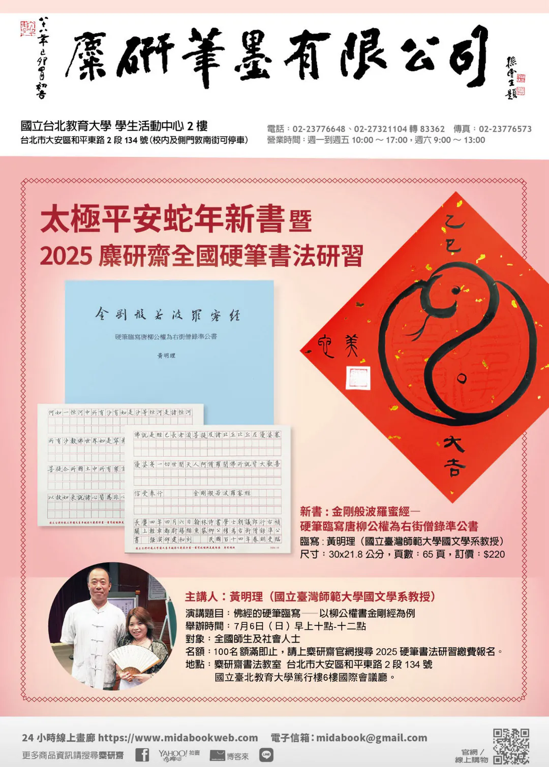 說明: 一、依據國立臺北教育大學114年5月5日北教大語字第1140850016號函辦理。 二、研習費用:教材費650元整。 三、報名方式:請至麋研齋官網搜尋:「2025硬筆書法研習」下單繳費,網址:https://reurl.cc/QY5Y49。(發票請至麋研齋親領,未領取者將統一捐贈慈善公益團體)。 四、研習內容: (一)時間:114年7月6日(星期日)上午10點至12點。 (二)講題:〔新系列〕佛經的硬筆臨寫——以柳公權書金剛經為例。 (三)講者:國立臺灣師範大學國文學系黃明理教授。 (四)地點:國立臺北教育大學至善樓B1國際會議廳(臺北市大安區和平東路二段134號)。 五、若有疑問請逕洽麋研齋:(02)27321104分機83362。 六、檢送海報1份。