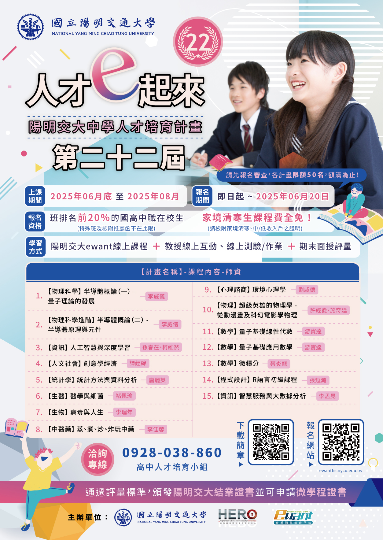 | [類別] 標題 | [11404894] 檢送國立陽明交通大學與中華國際創新教育資源交流協會辦理「第二十二期中學人才培育計畫」內容與資訊說明,請鼓勵同學踴躍參加,請查照。 | ||