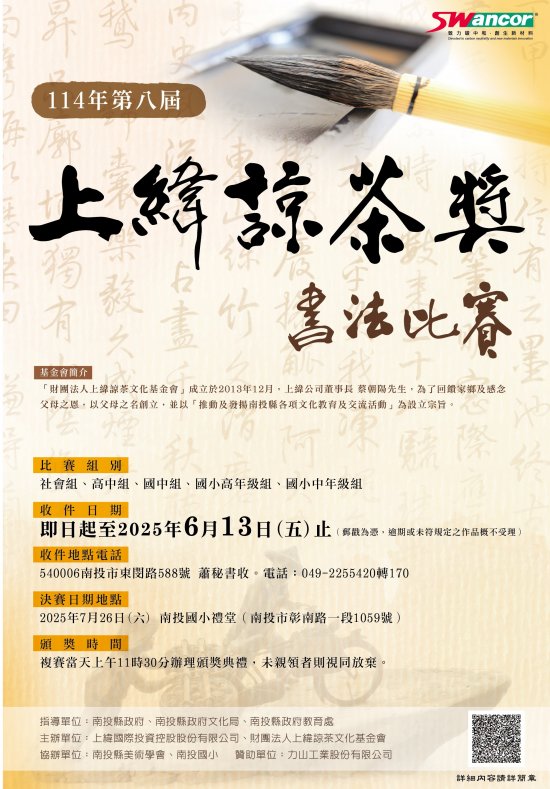 說明: 一、依據財團法人上緯諒茶文化基金會114年5月15日上諒文基字第1140005號函辦理。 二、初賽收件截止日期:即日起至114年6月13日(星期五)截止。 三、複賽日期:114年7月26日(星期日)假南投國小禮堂舉行。 四、若有疑義請逕洽基金會蕭淳瑩秘書,電話:(049)2255420分機170。 五、檢送書法比賽簡章及宣傳海報各1份。