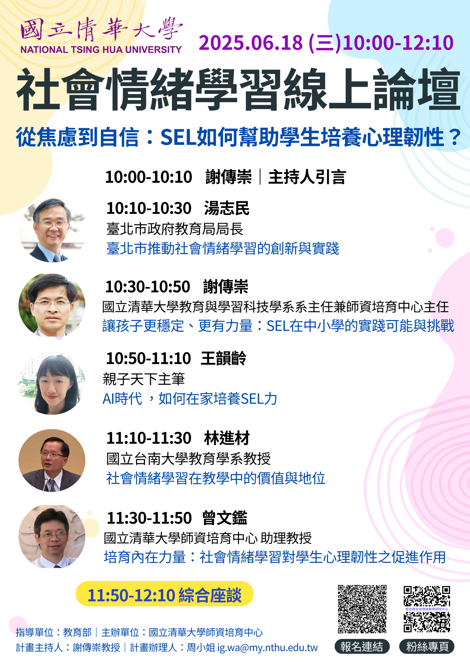 一、依據國立清華大學114年6月5日清師培字第1149004125號函辦理。 二、國立清華大學師資培育中心舉辦之論壇為「社會情緒學習-從焦慮到自信:SEL如何幫助學生培養心理韌性?」,旨在探討如何透過系統性教學,培養學生的自我覺察、情緒管理、人際互動與責任決策能力。透過專家講座與實務交流,期能協助教師深化SEL理念與教學策略,進而促進學生全人發展,強化學校教育支持系統。 三、論壇主持人為本校謝傳崇教授,邀請與談人包括臺北市政府教育局局長湯志民、親子天下主筆王韻齡、林進材教授與曾文鑑助理教授,針對主題進行專題演講與分享。 四、報名方式:請於6月16日前完成線上報名,因人數有限,錄取方式以報名先後順序為準,報名連結:https://forms.gle/wjGxoToRkBohtu617。 五、舉辦方式:旨揭論壇全程採用線上方式(Google Meet)進行,完成報名之與會者將於6月17日中午前收到論壇連線代碼。 六、檢附論壇海報1份,敬請參閱。 |