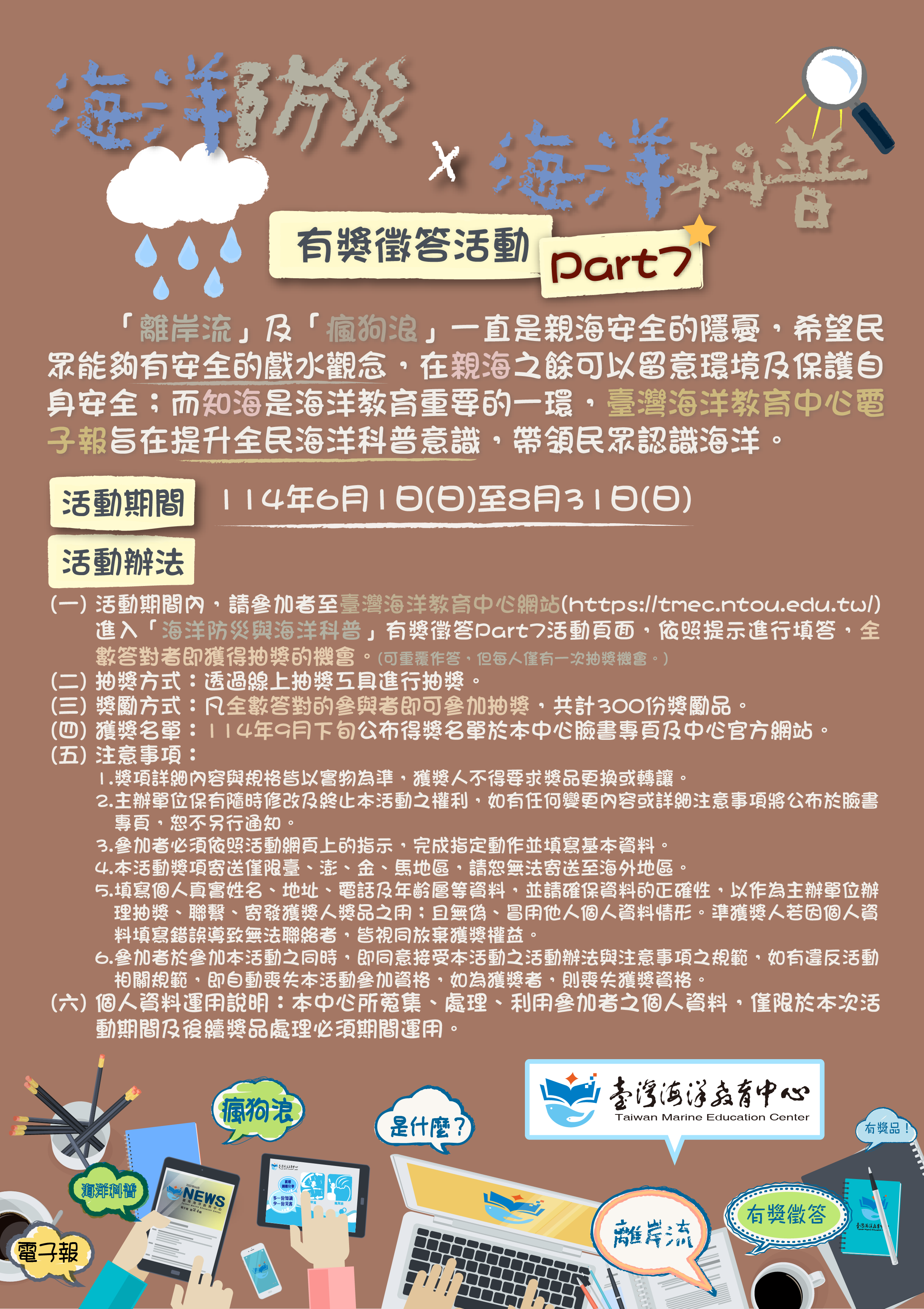 | [類別] 標題 | [11405546] 有關國立臺灣海洋大學臺灣海洋教育中心114年辦理海洋防災與科普有獎徵答活動,歡迎踴躍報名參與,請查照。 |