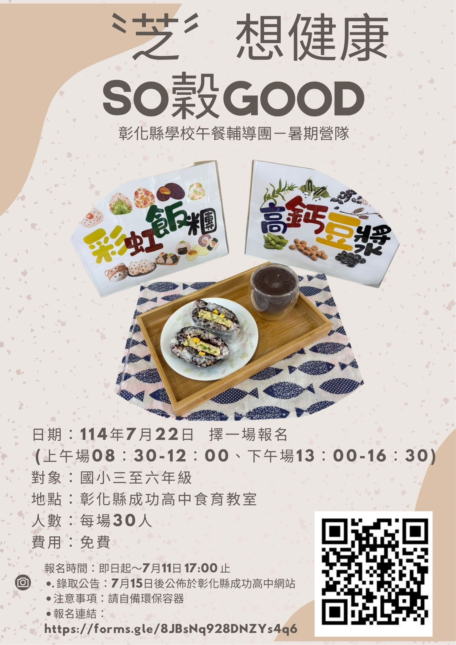 | [類別] 標題 | [11406455] 本縣學校午餐輔導團辦理-『”芝”想健康 SO 穀GOOD』暑期營隊,鼓勵學童踴躍報名參加。 |
