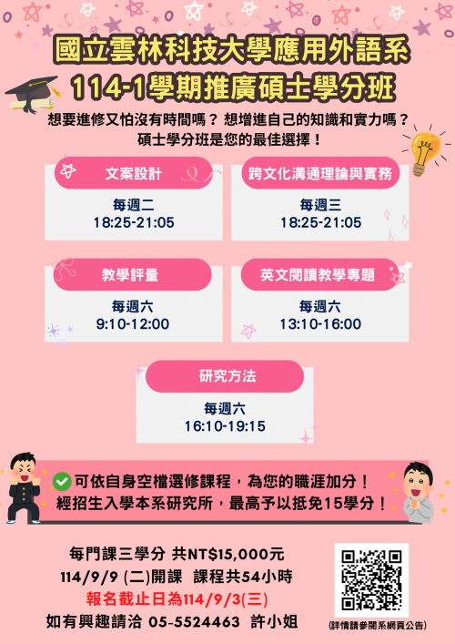 | [類別] 標題 | [11406491] 轉知國立雲林科技大學應用外語系推廣碩士學分班招生。 |