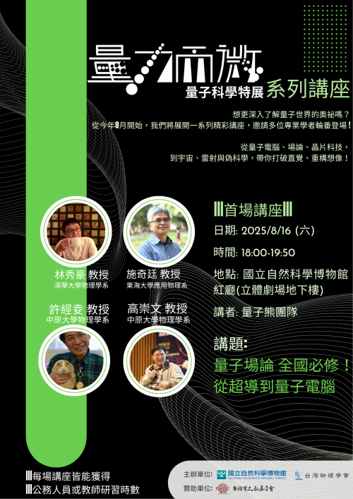 四、首場講座將於114年8月16日(星期六)18時至19時50分假國立自然科學博物館紅廳(立體劇場地下樓)舉辦,講題為「量子場論全國必修!從超導到量子電腦」,由林秀豪、施奇廷、許經夌與高崇文教授共同主講,內容豐富, 敬邀踴躍參與。