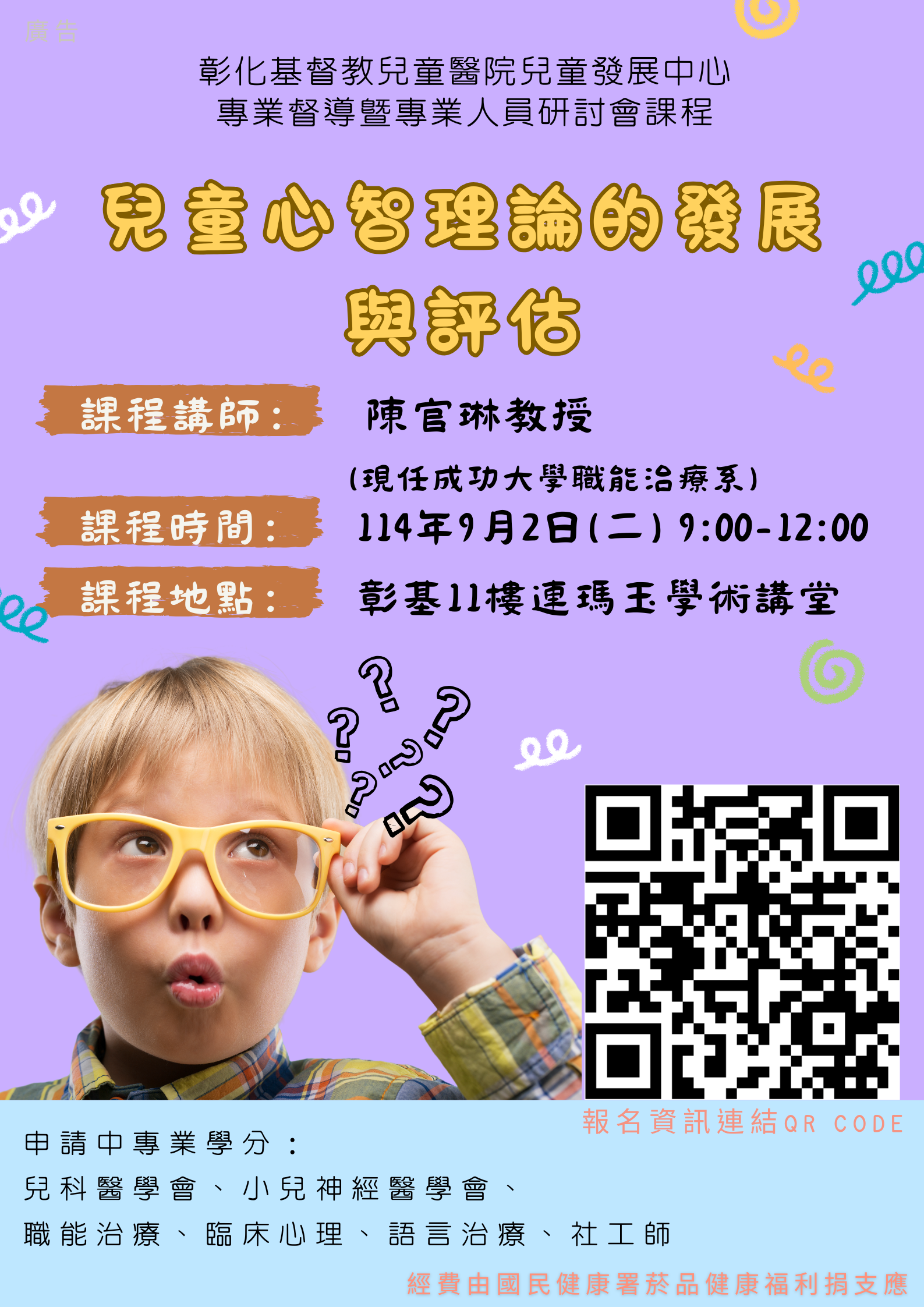 說明: (一)課程名稱:兒童心智理論的發展與評估 (二)講師:陳官琳教授(現任成功大學職能治療系教授) (三)活動時間:114年9月2日(二)09:00-12:00(8:45開始報到) (四)活動地點:彰基醫院11樓連瑪玉學術講堂 (五)參加對象:早期療育醫療衛生、教育與社政相關專業人員 (六)報名期限:即日起至額滿為止,限額60人 (七)報名方式:BeClass線上報名系統 (八)課程費用:免費(本經費由國民健康署菸品健康福利捐支應) (九)活動洽詢:TEL:(04)723-8595轉1164,兒童發展中心 (十)指導單位:衛生福利部國民健康署、彰化縣衛生局 (十一)主辦單位:彰化基督教兒童醫院兒童發展聯評中心、彰化基督教兒童醫院兒發中心 (十二)主辦單位保有活動更改之權力,活動過程會拍照製作活動成果,若介意者請先告知 (十三)預計申請專業學分:兒科醫學會、小兒神經醫學會、臨床心理師、語言治療師、職能治療師、社工師 |
