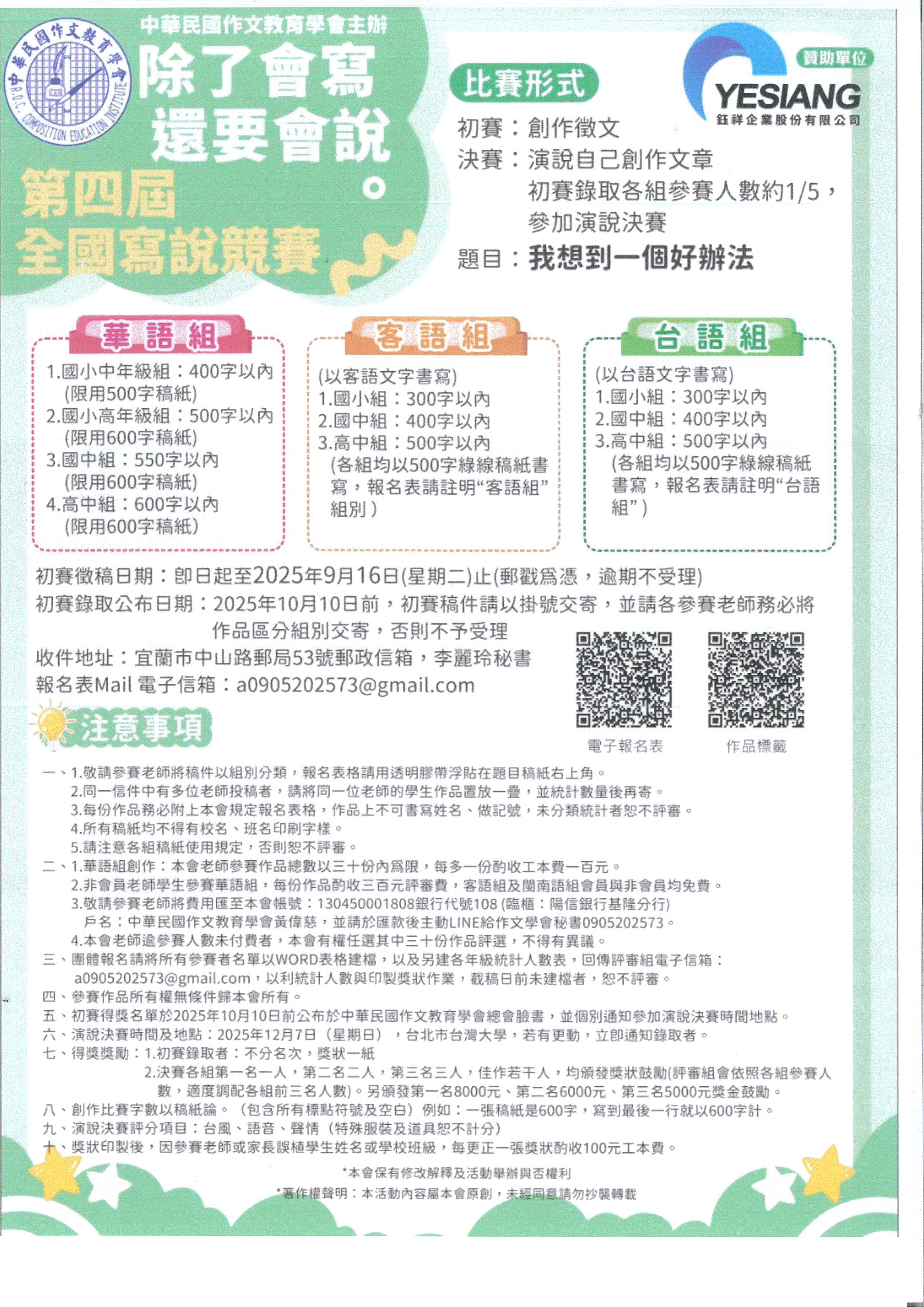 說明: 一、依據中華民國作文教育學會2025年8月18日114作文教慶字第00002號函辦理。 二、徵稿日期:即日起至114年9月16日(星期二)止(郵戳為憑,逾期不受理)。 三、檢送競賽須知1份。 |