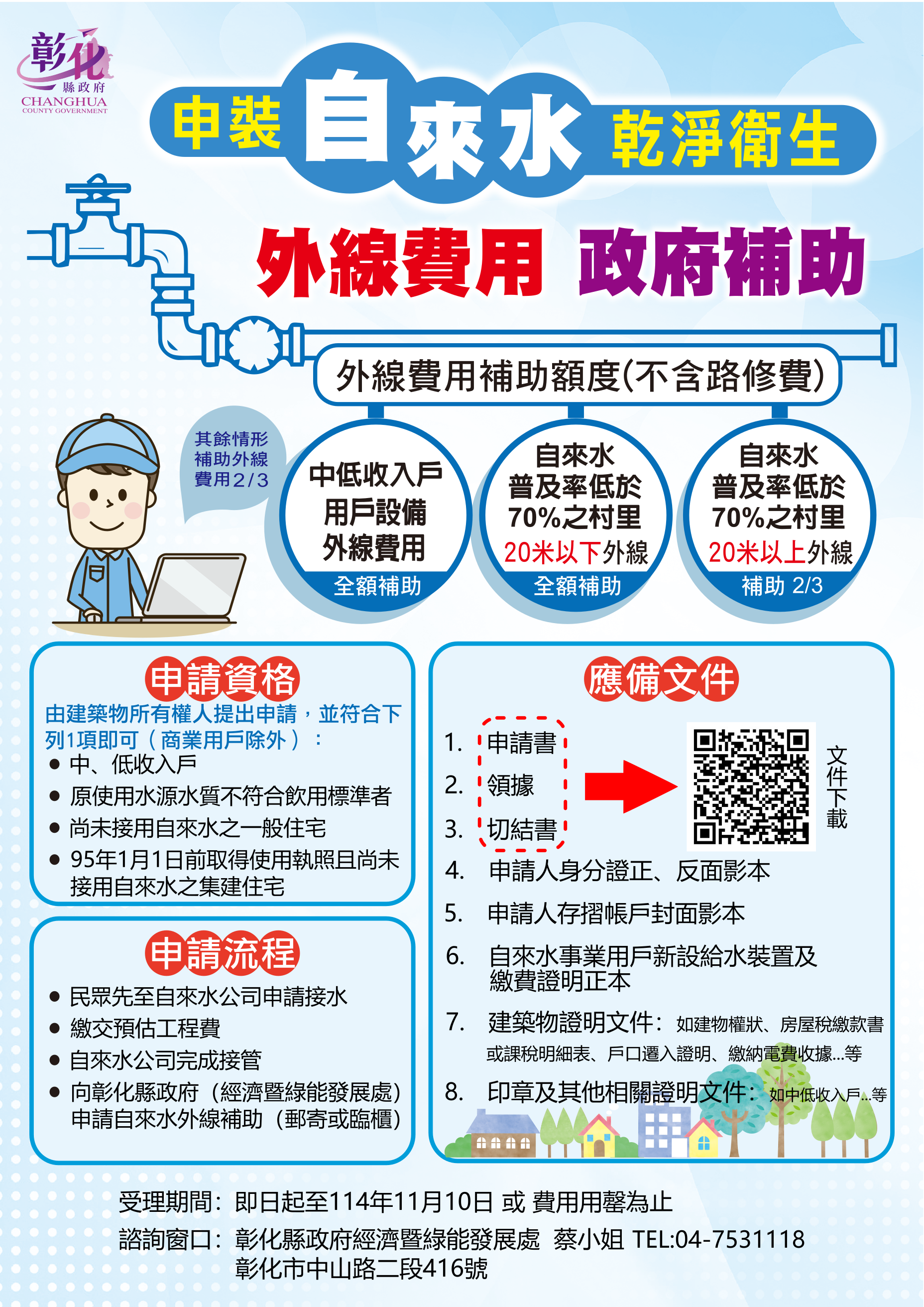 | [類別] 標題 | [11409432] 為保障民眾用水安全,減輕接水費用負擔,本府辦理114年「自來水用戶設備外線補助計畫」,將於114年11月10日截止受理申請案件(或經費用罄為止),請符合資格民眾踴躍申請補助。 |