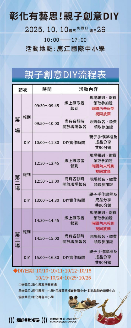 一、依據「2025台灣設計展~彰化有藝思!親子創意DIY實施計畫」辦理。 二、活動地點:鹿江國際中小學 三、活動時間:114年10月10日至12日(星期五至星期日)、18日至19日(星期六、星期日)、24日至26日(星期五至星期日),共8天例假日。 四、活動內容:因應彰化在地特色之主題,每日辦理4項手作課程,每項課程開設3場次。 五、費用:材料費50元至320元 (依各DIY項目材料費計算)。報名錄取後,請於各場次課程開始之前半小時現場辦理報到及繳交費用,並領取參加券。 六、報名連結如下:https://forms.gle/2boGuQsNT8LSKd2T8 |