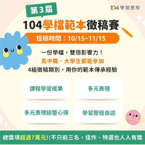 二、目的:旨在讓優良作品得以公開展現,使每份學習歷程檔案發揮加倍影響力,協助更多高中職生透過優秀作品借鏡與成長。 三、活動時程:114/10/15~114/11/15徵稿、114/12/29公告結果。 四、活動說明:邀請全臺高中、職學生投稿,高一至高三皆可參加,不限當年度學習歷程! 除先前有投稿過 104 學習歷程範本徵稿賽的作品,不可再投稿外,不限投稿件數。 五、徵稿作品:課程學習成果、多元表現、多元表現綜整心得、學習歷程自述。 六、評分標準:歷程省思40%、個人亮點30%、內容完整30%。 七、評審團隊:104人力銀行職涯永續長-王榮春老師、104人力銀行職涯教育講師-劉晨慧老師、大安高工-陳櫻仁老師,以及104學生團隊。 八、參賽獎勵:凡通過審核皆可獲獎狀,競賽總獎金逾7萬元,將頒發給各類作品的前三名、佳作,並會於高中組另選出10位特選、高職組選出18位特選提供加碼獎金。 九、報名方式:https://tw104.pse.is/8amqbk