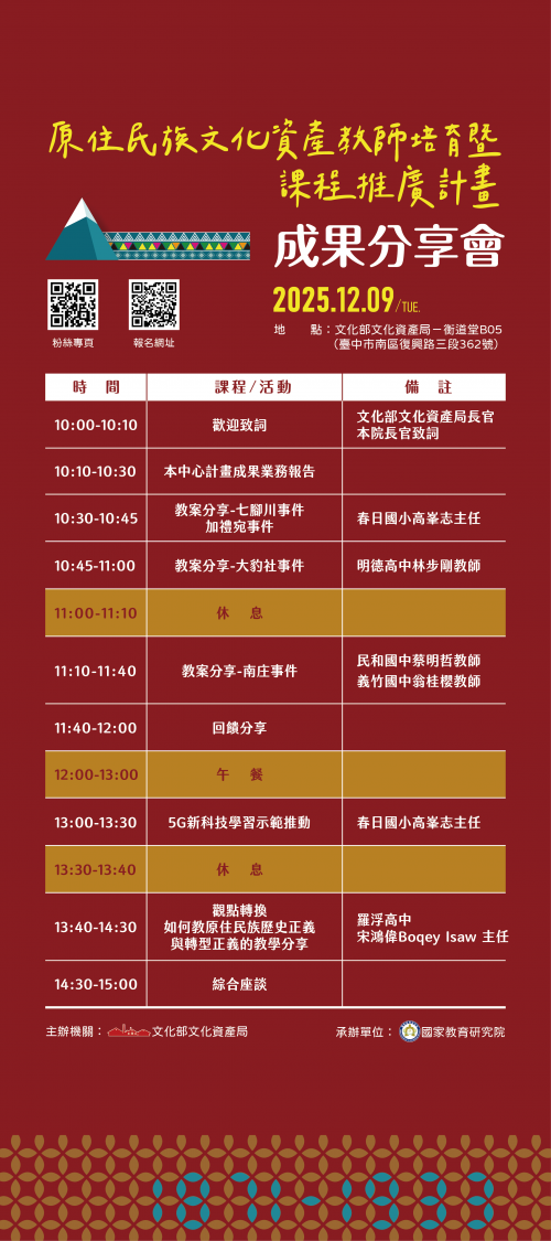一、依據國家教育研究院114年11月20日教研原字第1142501413號函辦理。 二、旨揭活動為國家教育研究院與文化部文化資產局合作之計畫成果分享會,透過教學現場的緊密連結與課程的專業發展,邀集教師組成走讀團隊,進行重要歷史事件場域之課程轉化,並開發相關教案,促使學生理解文化資產保存的基本觀念,期待作為未來推廣踏查課程之基礎。 三、時間與地點: (一)時間:114年12月9日(星期二)。 (二)地點:文化部文化資產局-衡道堂B05(臺中市南區復興路三段362號)。 四、報名方式: (一)採網路報名,自即日起至114年12月2日(星期二)下午5時止。 (二)報名網址:https://forms.gle/8XD9HASAQkRB5KQM9或掃描簡章中QR-Code。 五、聯絡人: (一)國家教育研究院原住民族教育研究中心李先生,聯絡信箱 ibanpito@mail.naer.edu.tw、聯絡電話:02-77407118。 (二)國家教育研究院原住民族教育研究中心吳小姐,聯絡信箱 yichiawu@mail.naer.edu.tw、聯絡電話:02-77407117。 六、檢附成果分享會簡章及電子海報各1份。 |