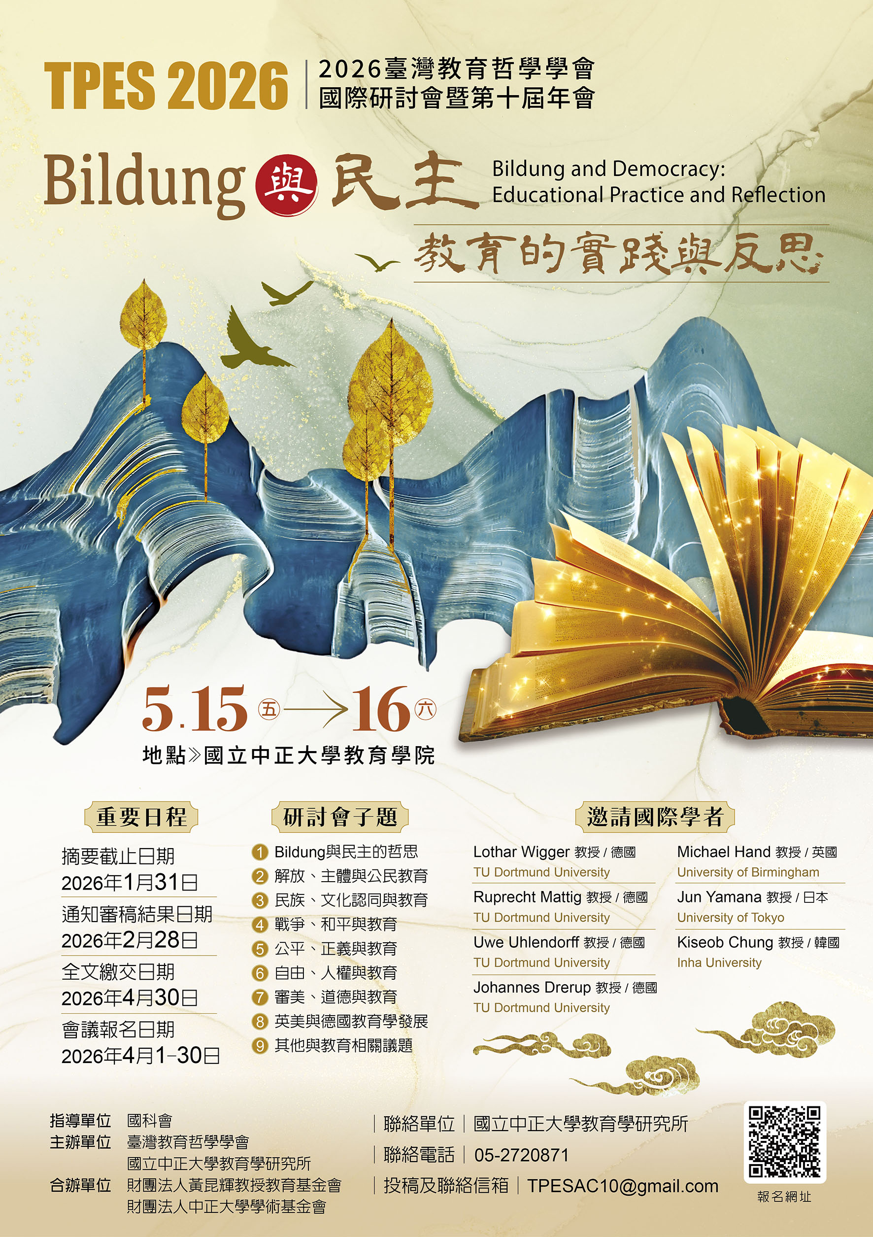 | [類別] 標題 | [11412601] 檢送國立中正大學教育學研究所「Bildung與民主:教育的實踐與反思」國際研討會暨「臺灣教育哲學學會第十屆年會」徵稿啟事,請鼓勵教師踴躍投稿,請查照。 | ||