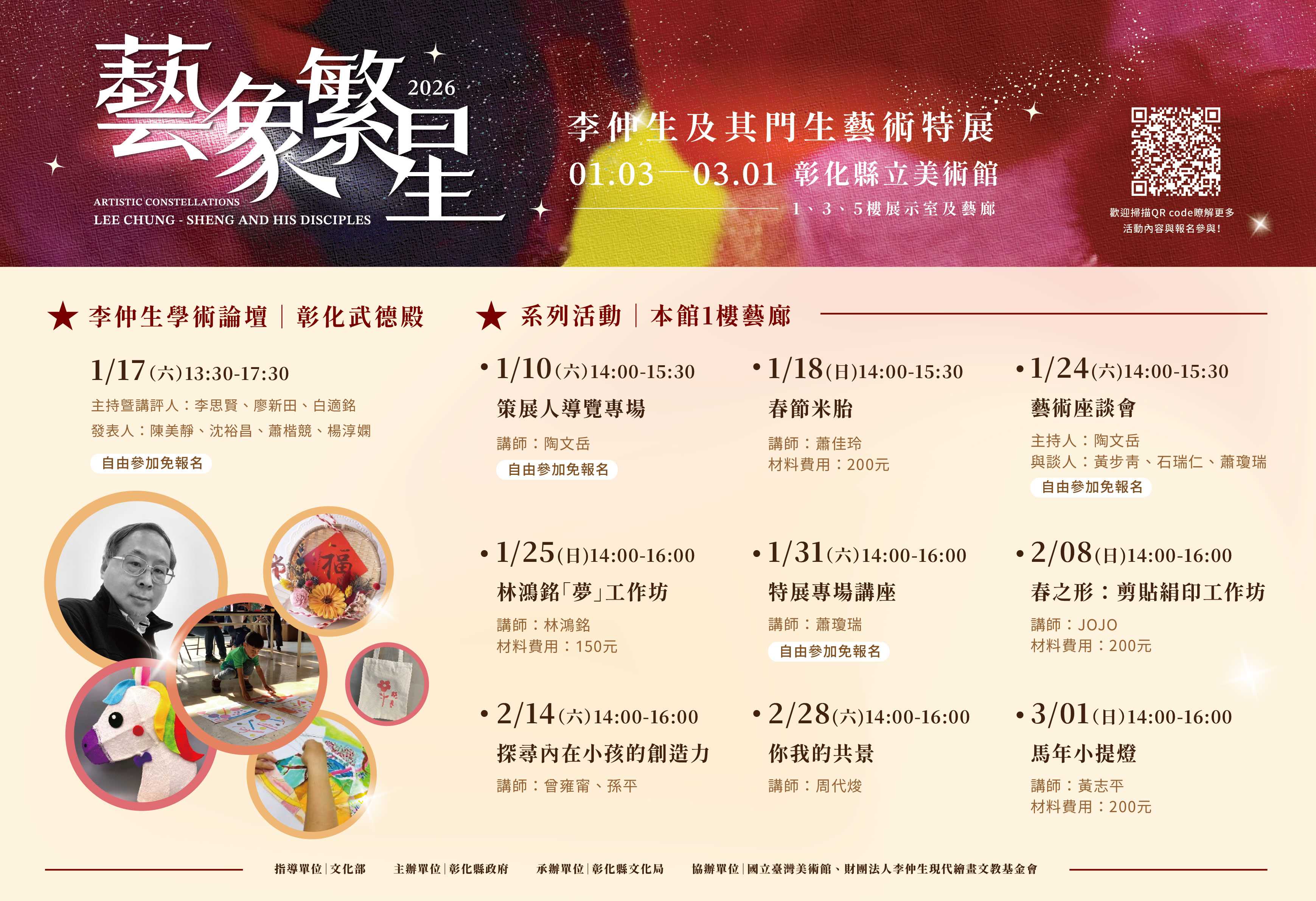一、依據彰化縣文化局115年1月14日彰文演字第1150000597號函辦理。 二、彰化縣立美術館自即日起至115年3月1日展出「藝象繁星- 李仲生及其門生藝術特展」,李仲生被譽為「臺灣現代藝術 導師」,其前衛思想與獨特教學,啟發無數藝術家,奠定臺灣抽象藝術與現代美術的基礎。 三、為推廣美學教育,彰化縣文化局舉辦「藝象繁星-李仲生及其門生藝 術特展」系列活動,包含學術論壇、展覽座談會、專場講座等,旨在深化展覽內涵,探討李仲生於台灣現代藝術發展之影響與學術價值。 四、各場次活動資訊如下: 五、為鼓勵本縣教師參與系列活動,提升文化美學知識與素養,請鼓勵貴校教師踴躍參與。 |