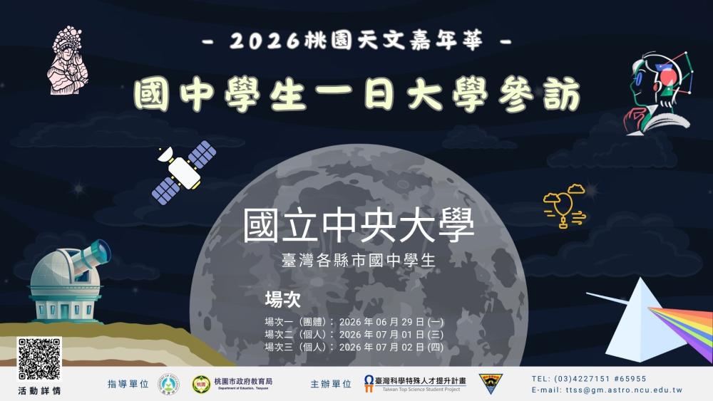 一、依據國立中央大學115年4月7日中大理天字第1153200123號函辦理。 二、該活動希冀透過參觀天文嘉年華主題展、參訪大學實驗室,讓國中學生了解天文相關知識及大學校系,啟發學生對基礎科學的興趣,並藉由外部的接觸與刺激開闊眼界,讓學生對未來有不同的想法。 三、活動訊息如下: (一)活動時間:115年06月29日(一)、115年07月01日(三) 、115年07月02日(四)。 (二)活動地點:國立中央大學。 (三)活動對象:臺灣各縣市國中及國中生。 (四)其他詳細資訊及報名方式,請參考活動網址:https://ps1tw.astro.ncu.edu.tw/ttss/index.php/2026astrocar_mvp/。 四、檢附2026桃園天文嘉年華—國中學生一日大學參訪活動簡章及活動海報各1份。 |