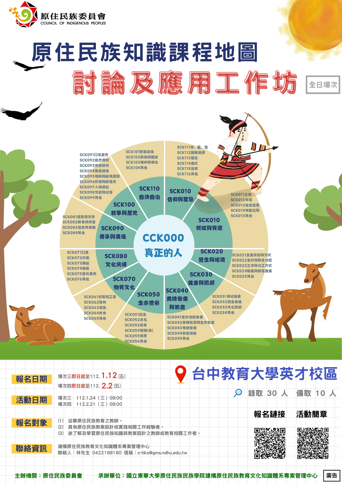 | [類別] 標題 | [11300012] 【轉知】國立東華大學於113年1月24日(星期三)、2月21日(星期 三)辦理「112年度原住民族知識課程地圖討論及應用工作坊」報名簡章及活動海報,請貴單位相關人才或有興趣者踴躍報名,請查照。 | ||