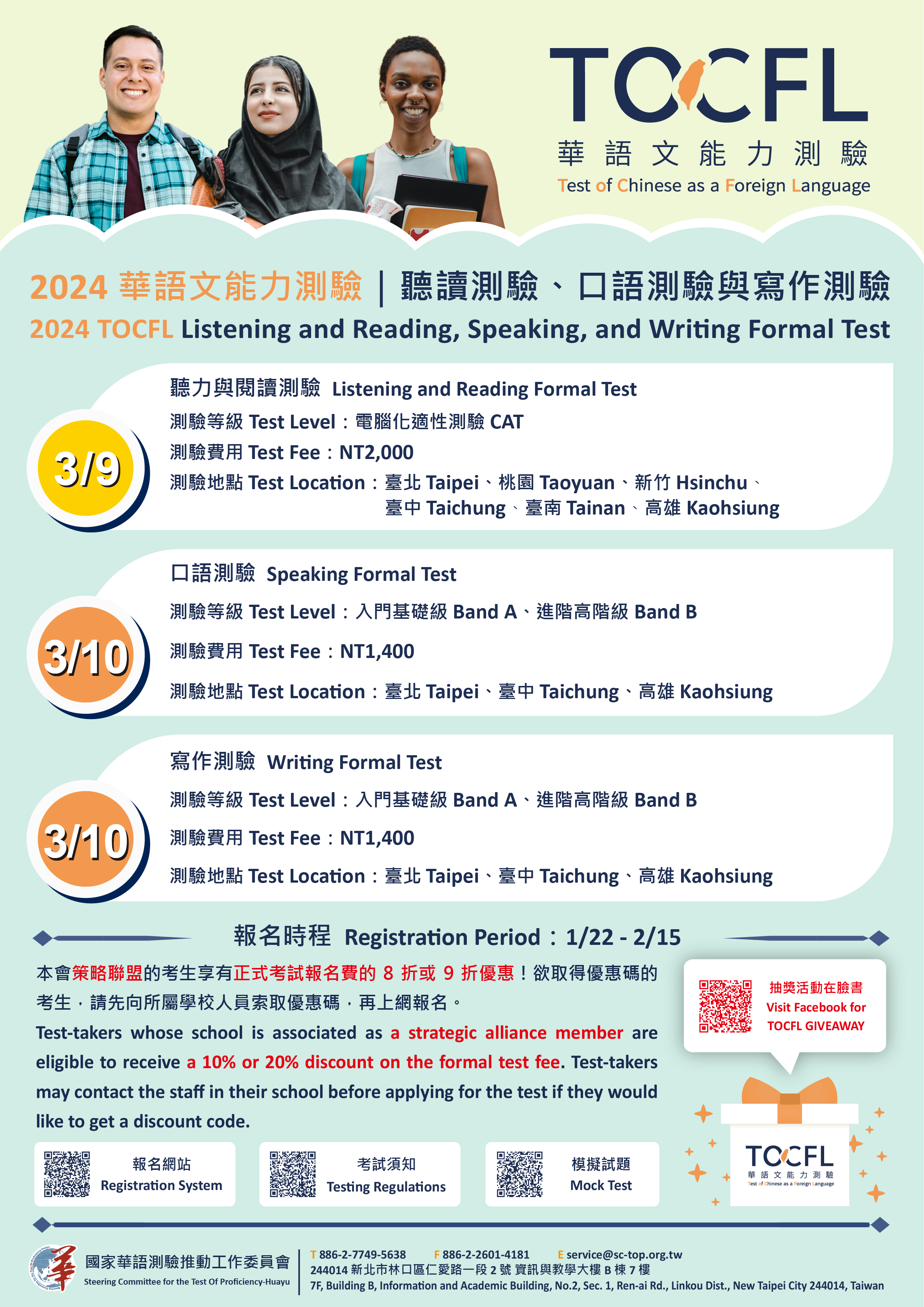 說明: 一、依據國家華語測驗推動工作委員會113年1月18日華測字第1132000011號函辦理。 二、報名時程:113年1月22日(星期一)至2月15日(星期四)止,報名截止日後,若有剩餘名額,將開放追加報名至2月16日止。 三、考試日期與項目: (一)3月9日(星期六):聽讀電腦化適性測驗。 (二)3月10日(星期日): 1、口語測驗:入門基礎級、進階高階級。 2、寫作測驗:入門基礎級、進階高階級。 四、測驗地點:國立臺灣師範大學、國立臺北教育大學、國立臺灣大學、中國文化大學、中國科技大學、中原大學、國立清華大學、靜宜大學、國立臺中教育大學、嘉南藥理大學、文藻外語大學,共11所考試中心。 五、測驗費用:(一)聽讀考試:新臺幣2,000元。(二)口語考試:新臺幣1,400元。(三)寫作考試:新臺幣1,400元。 六、優惠訊息:(一)同時報考聽讀、口語和寫作考試三項測驗,可以享八折優惠。(二)為本會策略聯盟單位,所屬僑外生可享九折優惠。(三)若策略聯盟單位系所,以華語文能力測驗作為入學或畢業門檻,所屬學位生可享八折優惠。 七、抽獎活動:凡報考任一測驗並完成繳費者,可參加華測FB粉絲專頁抽獎活動。詳情請見粉絲專頁貼文:https://www.facebook.com/SCTOP.TOCFL。 八、報名網址:https://reg.sc-top.org.tw/。 九、線上模擬測驗:https://tocfl.edu.tw/index.php/exam/test/page/19。 |