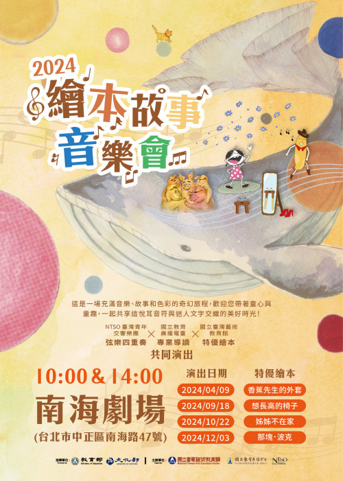 三、「2024年繪本故事音樂會」訂於2024年4月9日(星期二)、9月18日(星期三)、10月22日(星期二)及12月3日(星期二)等4日之上午10點及下午2點,合計8場次,於該館南海劇場(臺北市中正區南海路47號)演出,誠摯邀請有興趣的師生前來聆賞。