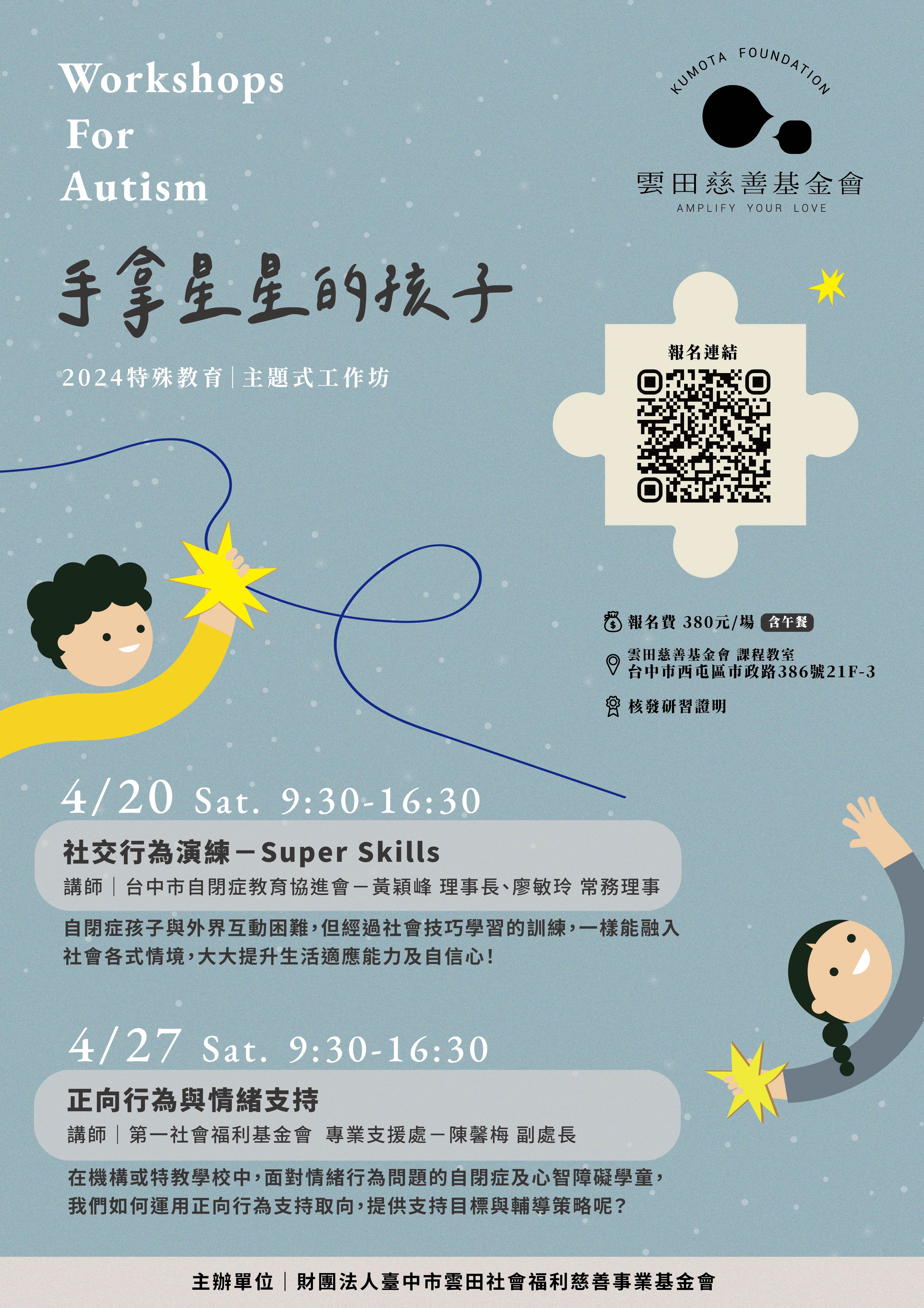 | [類別] 標題 | [11302579] 轉知財團法人臺中市雲田社會福利慈善事業基金會舉辦「手拿星星的孩子-特殊教育主題式工作坊」之活動內容,鼓勵殊教育相關教職人員參與,請查照。 | ||||||||||||||