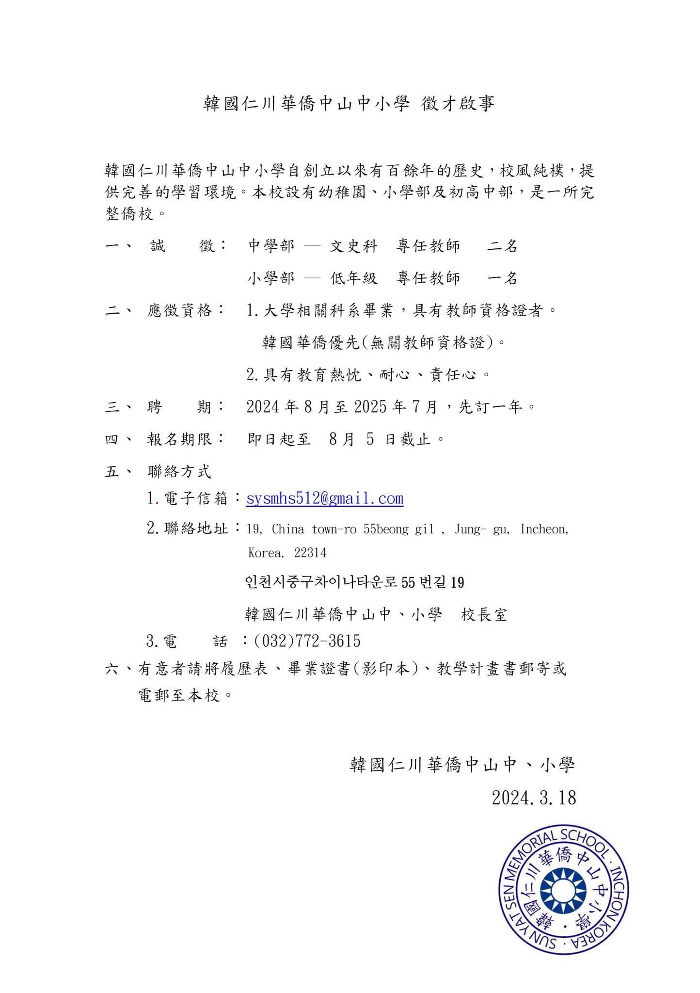 | [類別] 標題 | [11303006] 轉知韓國地區仁川華僑中山中小學及漢城華僑中學113年徵聘教師訊息,請查照。 |