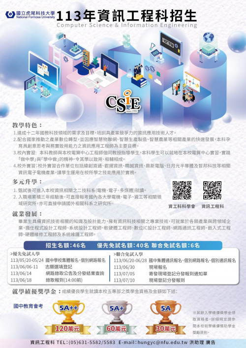 二、該校資訊工程系五專學制「資訊工程科」將於113學年度招收新生,名額共計46名。