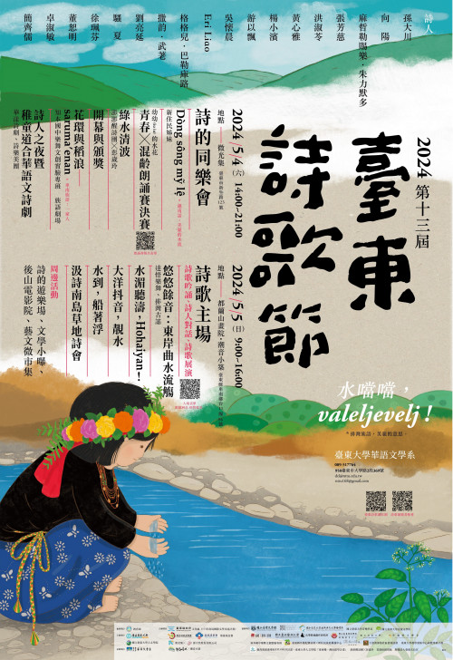 說明: 一、依據國立臺東大學113年4月24日東大華語字第1131002853號函辦理。 二、臺東詩歌節今年以「水噹噹,valeljevelj!」為題,從臺東╱臺灣出發,連結世界南島民族文學家,在族群多元、文化多彩、語言繽紛、風土靚秀、人情真媠的「臺東」,以詩歌的對談、展演與再製等多重表現形式,詮釋與流佈南島人文風華。 三、日期:113年5月4日至5月5日(星期六、日)。 四、倘有疑問請洽國立臺東大學華語文學系,電話:08-9517764。 五、檢送計劃書及海報各1份。