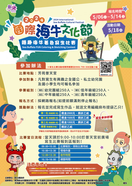 二、2024國際海牛文化節邀請喜愛寫生的國小學生及幼兒園孩子們在芳苑,透過雙眼及畫筆紀錄交織出每位孩子心中獨特的芳苑海牛文化。