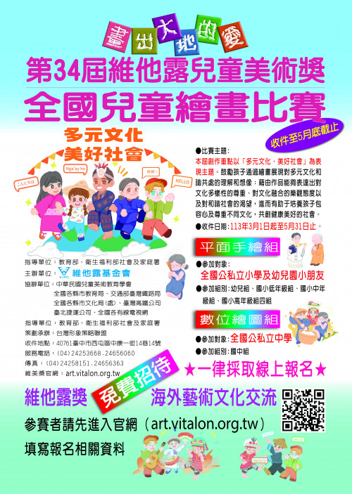 說明: 一、依據財團法人維他露社會福利慈善事業基金會113年4月20日維113年兒美字第003號函辦理。 二、本屆創作重點以「多元文化•美好社會」為表現主題。鼓勵孩子通過繪畫展現對多元文化和諧共處的理解和想像;藉由作品能夠表達出對文化多樣性的尊重、對文化融合的樂觀態度以及對和諧社會的渴望,進而有助于培養孩子的包容心及尊重不同文化,共創健康美好的社會。 三、檢附海報及徵件簡章各1份。 |