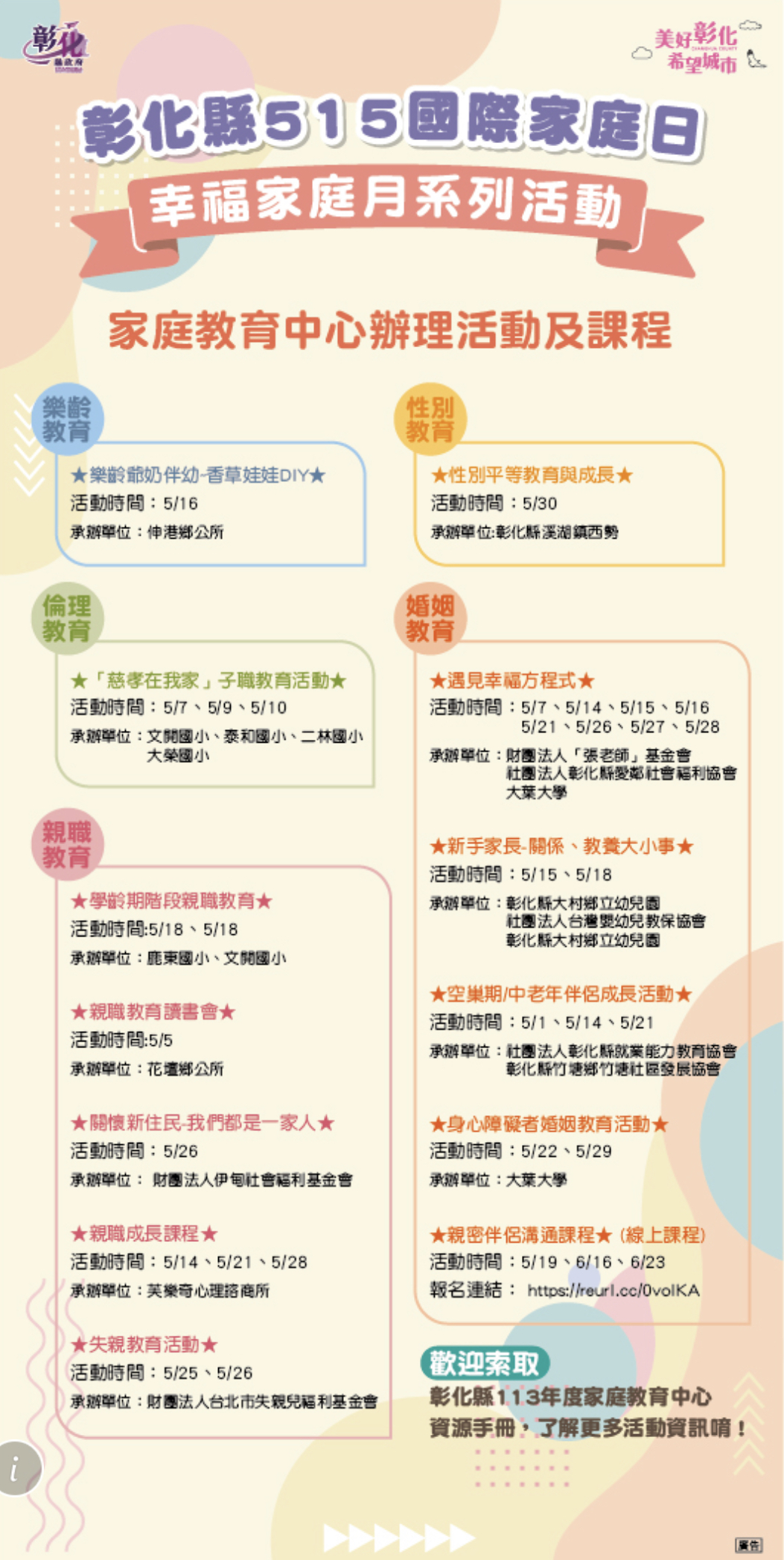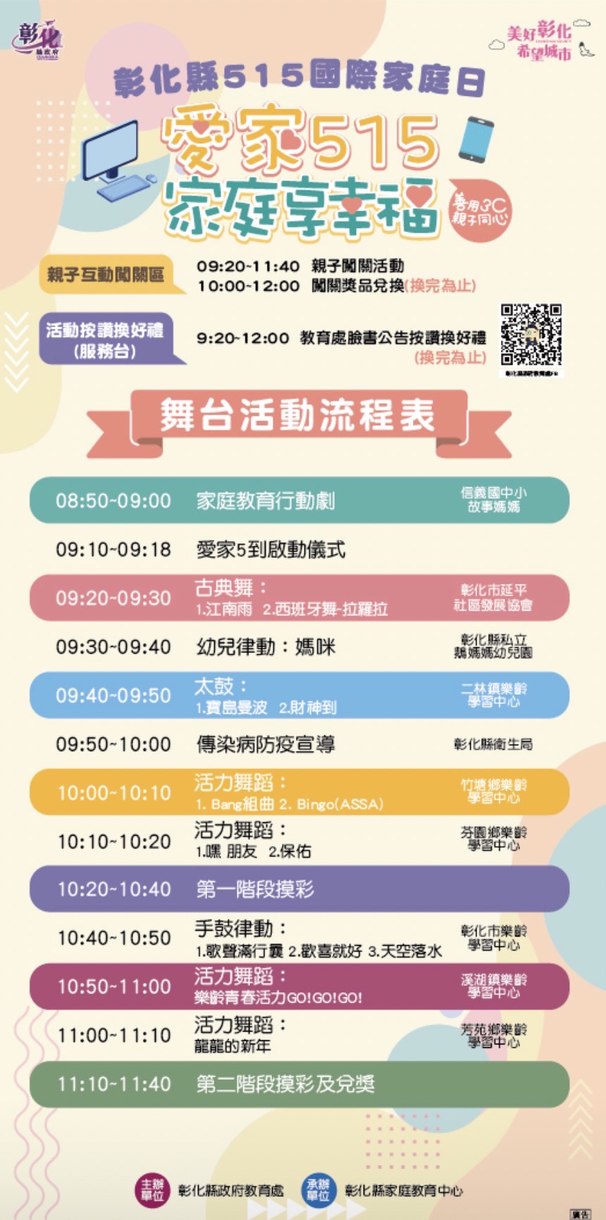 一、依據本縣113年度國際家庭日「愛家515-家庭享幸福」活動實施計畫辦理。 二、為響應5月15日國際家庭日,宣傳本縣家庭教育推動成效。本縣家庭教育中心辦理515國際家庭日系列活動,結合家庭教育行動劇與相關網絡局處宣導攤位,訂於113年5月5日(星期日)上午8時50分假彰化市延平公園辦理113年度國際家庭日「愛家515 家庭享幸福」活動,敬邀請貴校校長、師生及家長們共襄盛舉,並參加闖關、摸彩以及臉書按讚換好禮等活動。請學校廣為宣傳、提供活動資訊於學校首頁及轉傳家長通訊群組。 三、系列活動規劃有親子互動影片甄選及「幸福家庭月」講座,影片甄選成果將於活動現場播放及宣傳,呼籲在3C盛行的網路世代仍要重視家人關係。 四、彰化縣113年度「國際家庭日?愛家515-家庭享幸福」活動 (一)日期:113年5月5日(星期日)8:50~12:00 (二)地點:彰化市延平公園社區活動中心前廣場 五、檢送本活動宣傳EDM、表演時間表、場地配置圖及幸福家庭月活動海報。 |