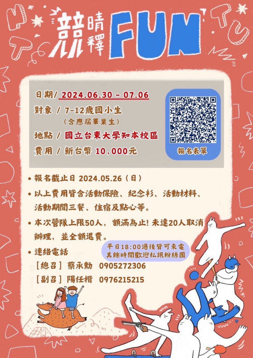 | [類別] 標題 | [11304437] 轉知:檢送國立臺東大學運動競技學士學位學程辦理暑假營隊活動「競晴釋FUN 拼盡全力!選手們的奇幻冒險」,歡迎踴躍參加,請查照。 | ||