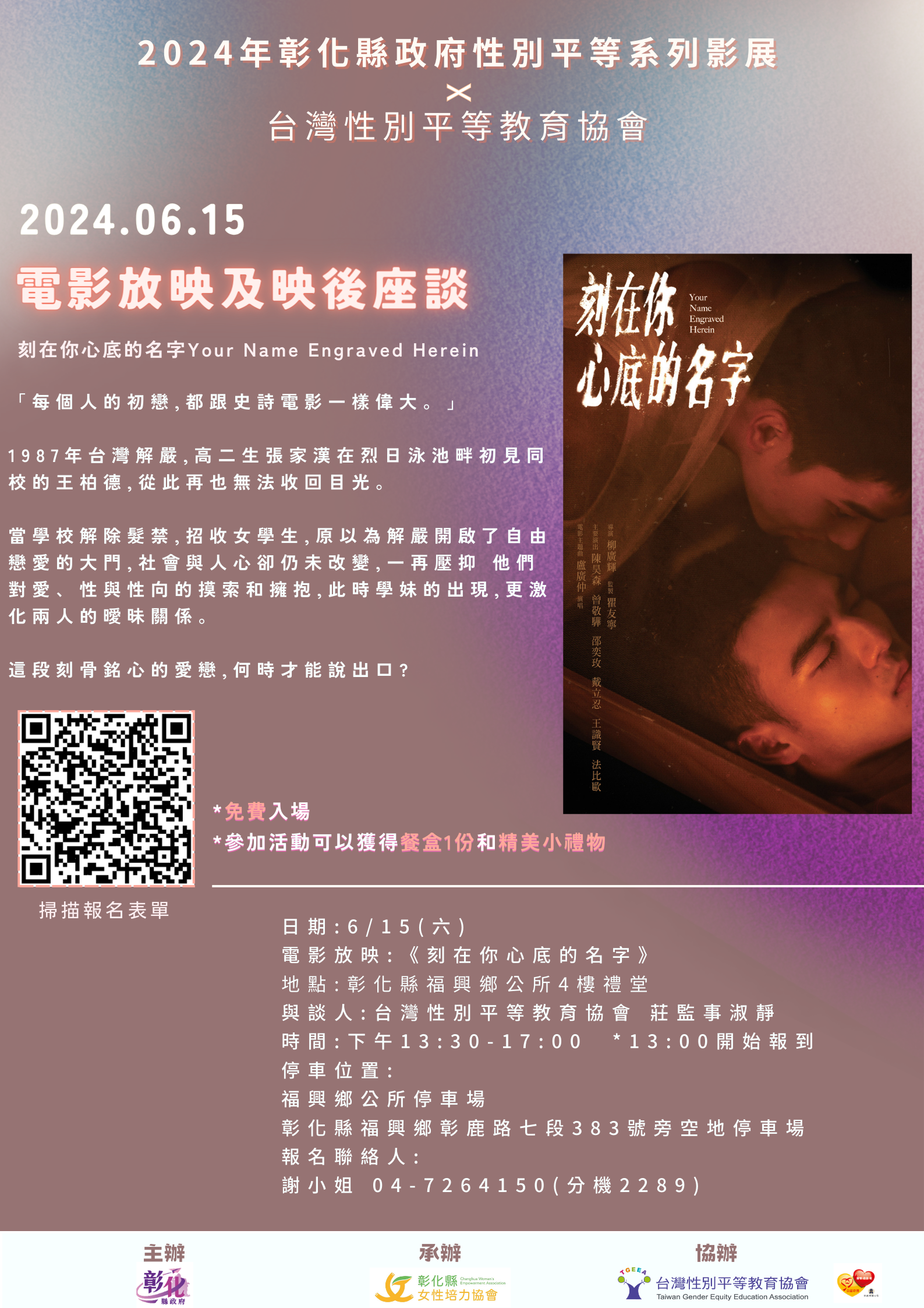 一、依據本府113年5月15日府社婦民字第1130175618號函辦理。 二、為增進民眾認識相關性別平等議題,破除性別刻板印象及覺察性別事件,營造性別友善社會,特委託彰化縣女性培力協會辦理旨揭影展,並邀請專家學者進行映後座談,希望讓影片中的議題,能帶給觀眾更多的思考與啟發。 三、課程內容及報名方式說明如下: (一)活動對象:社區民眾等。 (二)播映電影:《刻在你心底的名字》。 (三)播映時間及地點:113年6月15日(星期六)下午1時30分至下午5時,於福興鄉公所4樓禮堂(彰化縣福興鄉彰鹿路七段495號)。 (四)報名方式:至GOOGLE表單(https://forms.gle/V6jty4pWgDq5ouqW7)線上報名或以電話團體報名:04-7532289與04-7532292。 三、活動期間除補充水分外,禁止飲食。 四、本府同仁參加此影展,可登錄性別平等進階課程公務人員終身學習時數3小時。 五、如有相關問題請洽本案活動聯絡人,社會處婦女及新住民福利科,謝小姐,電話:04-7532289。 |