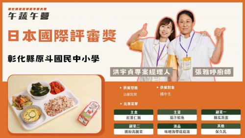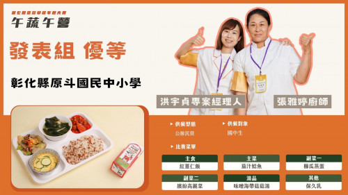 本次比賽以"蔬食"為主題,旨在改變民眾對於蔬菜食物的刻板印象,同時呼應了當前對於氣候變遷和健康生活方式的關注,期待透過少肉多蔬的飲食模式為孩子們打造更為健康的校園午餐。二林鎮原斗國民中小學專案經理人洪宇貞和廚師張雅婷,參賽作品為紅薏仁飯、茄汁鯰魚、櫛瓜蒸蛋、繽紛高麗菜、味噌海帶菇菇湯及保久乳;他們的參賽作品展示了豐富多彩的創意和精湛的技藝,透過精心設計的菜單及獨特的食材運用,再加上二林在地雜糧作物的融入,他們為評委們帶來了一場視覺及味覺的盛宴。
