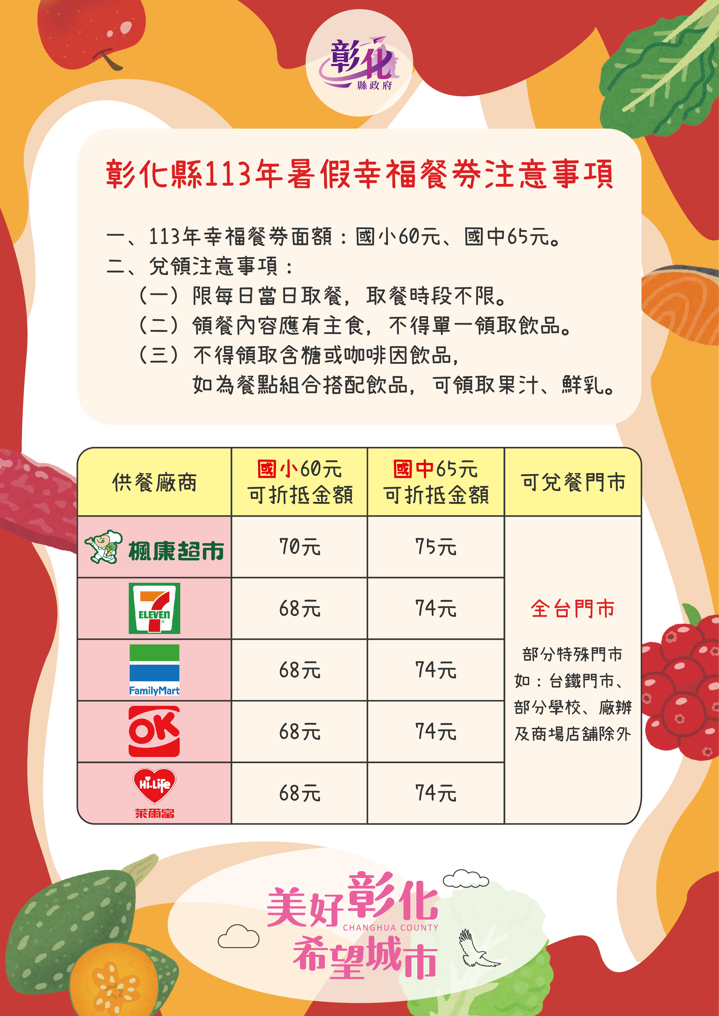 一、爰萊爾富國際股份有限公司業以113年5月24日(113)萊函字第8300-H0025號函知本府調整113年暑假幸福餐券可折抵金額,故修正113年暑假幸福餐券注意事項,請各校協助轉知領有幸福餐券之經濟弱勢學生。 二、檢附「彰化縣113年暑假幸福餐券注意事項」1份。 |