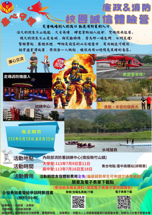 3.活動地點:內政部消防署訓練中心、紫南宮、內政部消 防署特種搜救隊及法務部廉政署中部地區調查組。